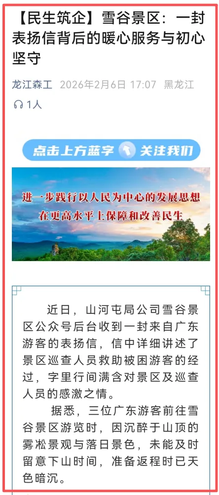 近日,山河屯局公司雪谷景区公众号后台收到一封来自广东游客的表扬信,信中详细讲述了景区巡查人员救助被困游客的经过,字里行间满含对景区及巡查人员的感激之情。