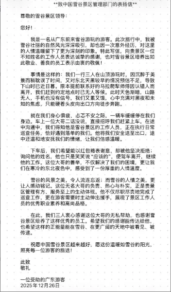 游客在表扬信中提到,巡查人员的帮助让他们在寒冬中感受到了温暖,也让他们对雪谷景区留下了深刻的良好印象。