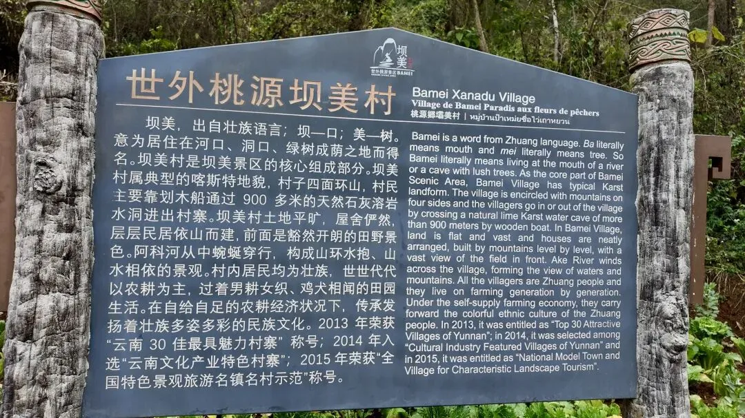 属于文山市 : 喀斯特地貌,山峰奇特,村子四面环山,溶洞层叠散布. 进出村子主要靠村前村后两个天然的石灰溶岩水洞,入口950米出口680米长.这里是壮族自治区,村里都是本地人. 基本上所有民宿都是本地人开的,沿着主路都是民宿。