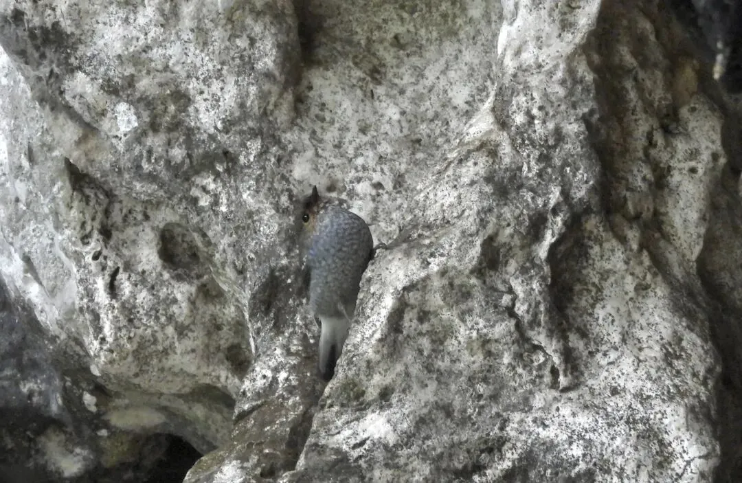 进洞口的河旁边有步道,可以走过来仔细看看旁边的一个古溶洞的结构和气质. 哎,一只红尾水鸲把自己卡在里面。古溶洞口-里面没人,没蝙蝠,只有一条路,我们带了两只强力手电。转进洞里完全黑暗,没有信号,也听不到外面的任何声音。幽暗恐惧症的不要来了。喀斯特地貌的奇石很多。没有头盔和头灯我们也没有走多远。进去走了两次,第一次走到人不能直立通过为止,单程大约200米左右吧。第二次越过了弯腰的部分一点,看到了一大块晶莹的闪光的比较大的非常漂亮的白色流石瀑布,两次均往返约半小时。路面比较平整,有小蟋蟀。坝美村据说北宋时期村民已在此居住再走一点能看到一块石头需要绕过去-有点像一个人的咽喉啊。恐怖片既视感。像走在什么生物的肚子里绕过去是因为底下有个深沟,里面有溪水,下面有暗河.