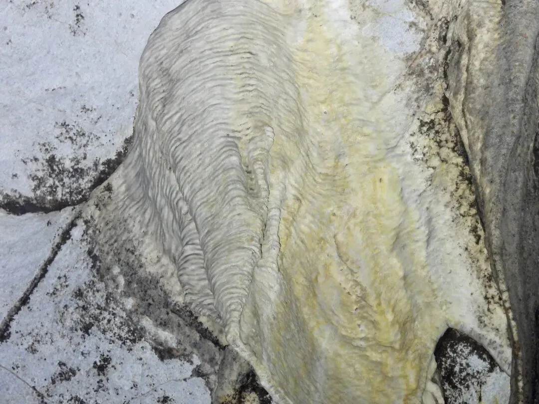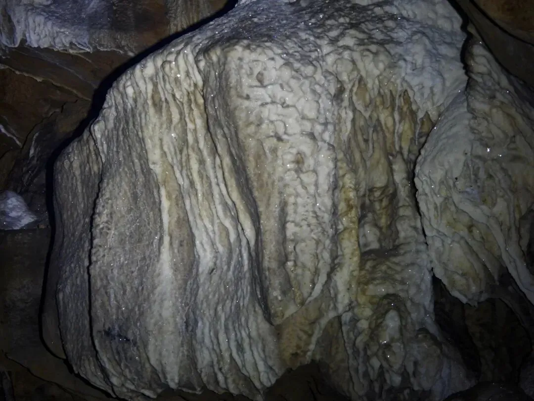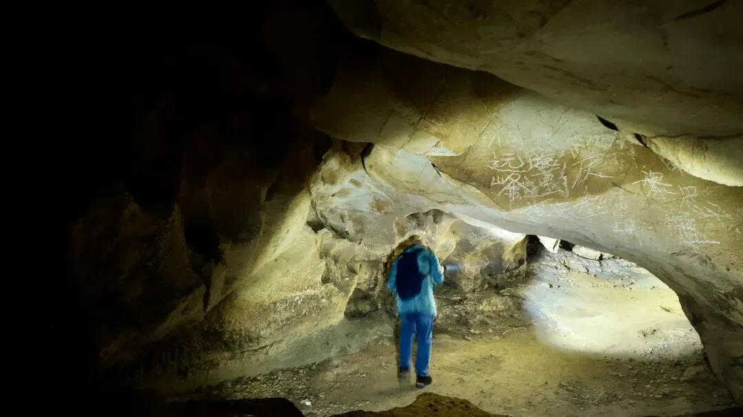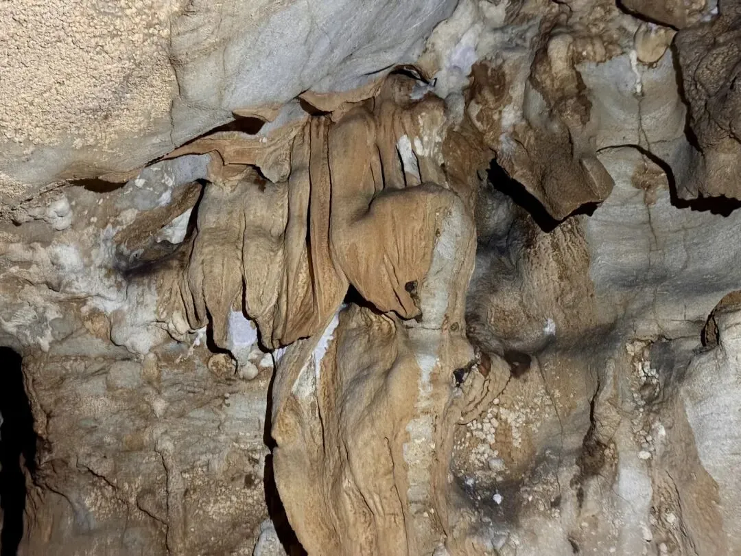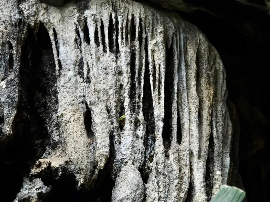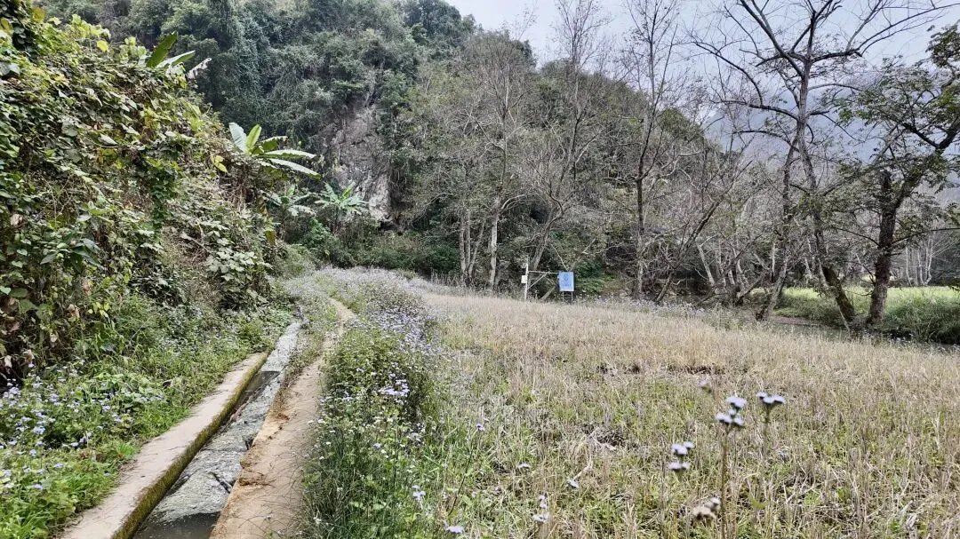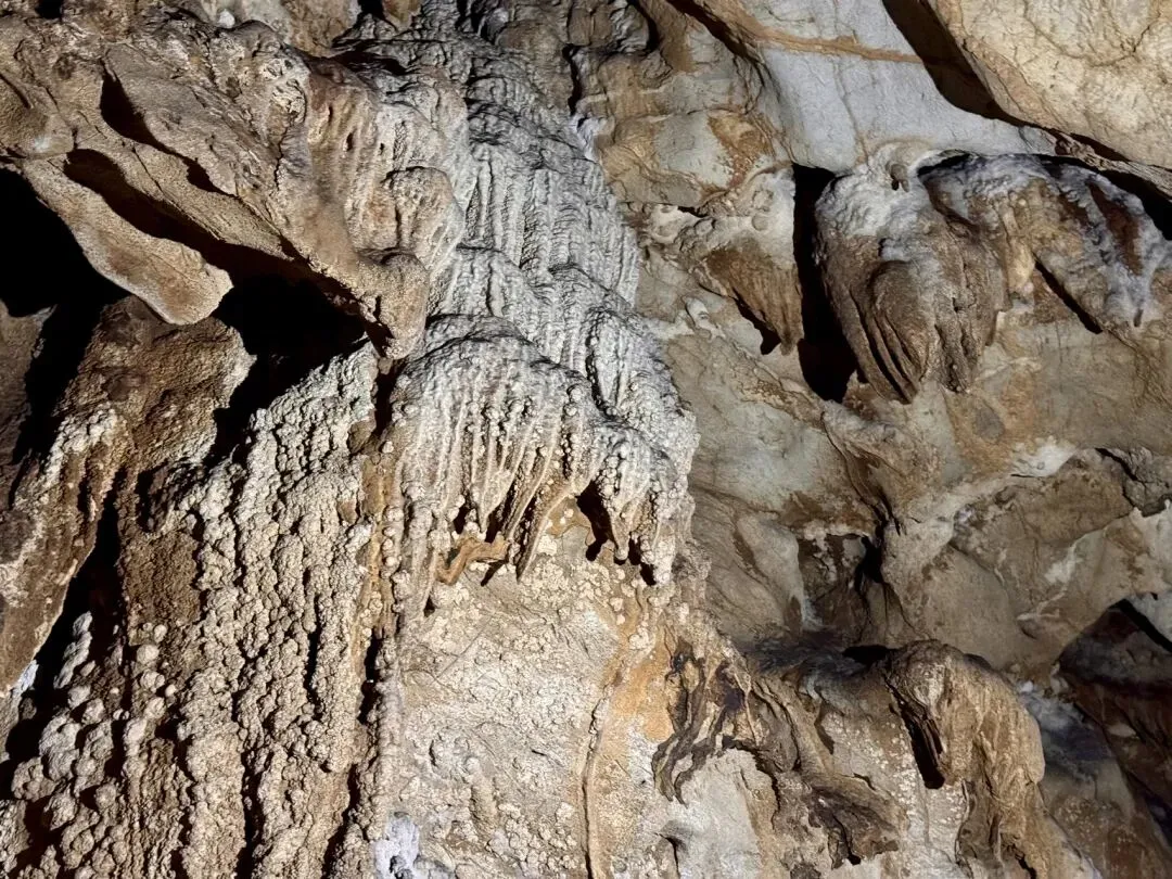 第一次抵达的最后的地方:第一次感觉要弯腰有点艰难就不去了。回来后问老板说弯腰进去后面还有200-300米。第二天想好好看看墙壁的奇石和一些流石,石幔之类的样子,走到第一次终点这里没留意竟然轻易就过去了。之后发现景色太漂亮没来过才发现已经走过这块弯腰的地段了,眼前闪出一大块发光的晶莹的白色的大流石瀑布.流石的形态和光泽是判断溶洞是否仍有活跃水流的重要标志之一,也是极具观赏价值的地质奇观。溶洞上方的地下水溶解了石灰岩中的碳酸钙,形成碳酸氢钙溶液。当水流沿洞壁流下时,压力降低、水分蒸发,碳酸氢钙分解,析出碳酸钙。碳酸钙逐层沉积,日积月累就形成了这种层叠的流石结构。第二次越过第一次的终点一点路走到这块闪光的大流石返回.路线比较熟悉返回的比较快。这个喀斯特地貌古溶洞太神奇了。第二天拍的第一天终点处:对比照片后确认是一个地方.一大堆晶莹闪光的白色流石,像白色流下的钻石瀑布,好漂亮!就是这一堆!这些溶洞里的石幔与流石,不是一朝一夕的偶然,而是亿万吨缓慢穿行的地下水,裹挟着石灰岩,以每百年仅长一点点的长度,在黑暗中沉默堆积,历经数十万乃至上百万年的漫长雕琢,日复一日,年复一年,成了大地最沉默、最漫长的精品作品。第二次终点就走到这里了. 感觉再进去怕有岔路,差不多该看的也都仔细看到了。再进去怕不好分辨方向,也没有头盔和头灯。原路返回。标准生长速度(全球溶洞通用)最常见的钟乳石、石幔、流石:平均 100 年 生长 0.1~1 厘米水质纯净、水流稳定的优质环境:最快 100 年长 1~3 厘米水流快、杂质多的地方:100 年连 0.1 厘米都长不到后来发现山崖上有很多洞洞,估计里面有大部分是空的洞腔。👇🏻都是山崖峭壁上的洞口形状这个洞大概率是进来水道上方透光的洞的入口里面有钟乳石。哇!这块石头太像小狗了!如果山崖上方的的溶洞能进去,估计也是内部很多奇观.只是无法进去。 综合上面的信息,我感觉山体内有很多远古的溶洞。当然这个也是此种地质正常的特点。如果我会飞,就可以上去看看。漫山遍野的藿香蓟-菊科藿香蓟属的一年生草本植物,是云南野外极为常见的野生花卉。原产于热带美洲,现广泛归化于我国云南、广东、广西等南方地区,是云南山野中最常见的野生草本花卉之一。 适应能力极强,能在多种土壤环境中生长,成片分布形成紫色花海。
