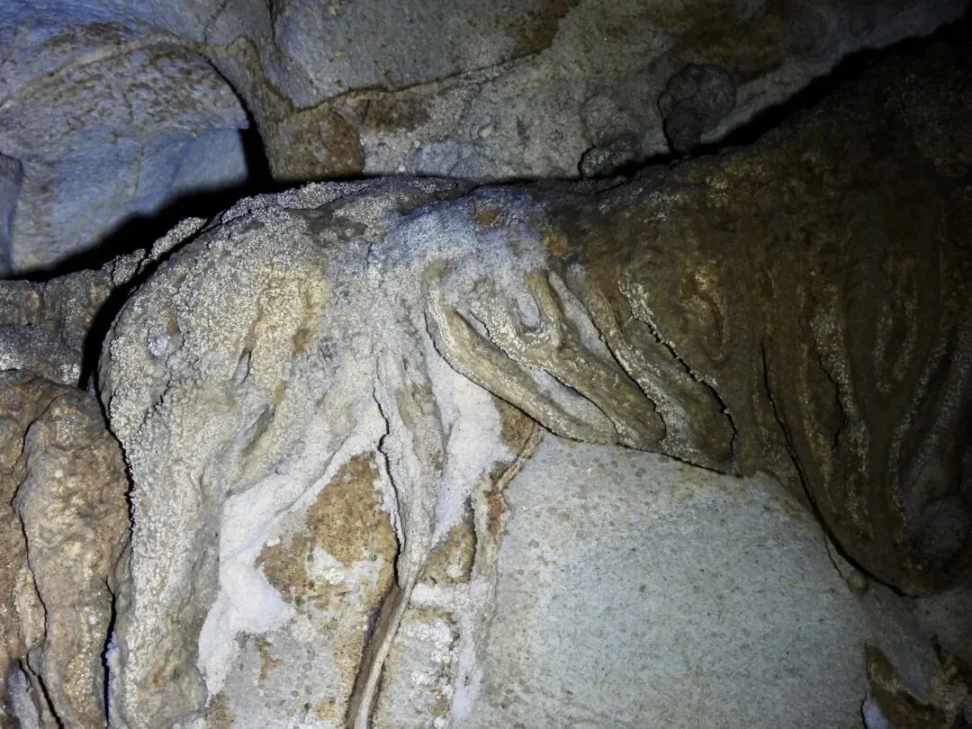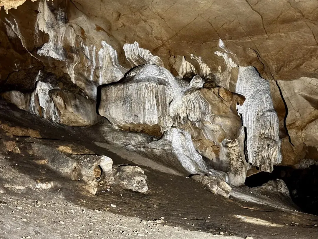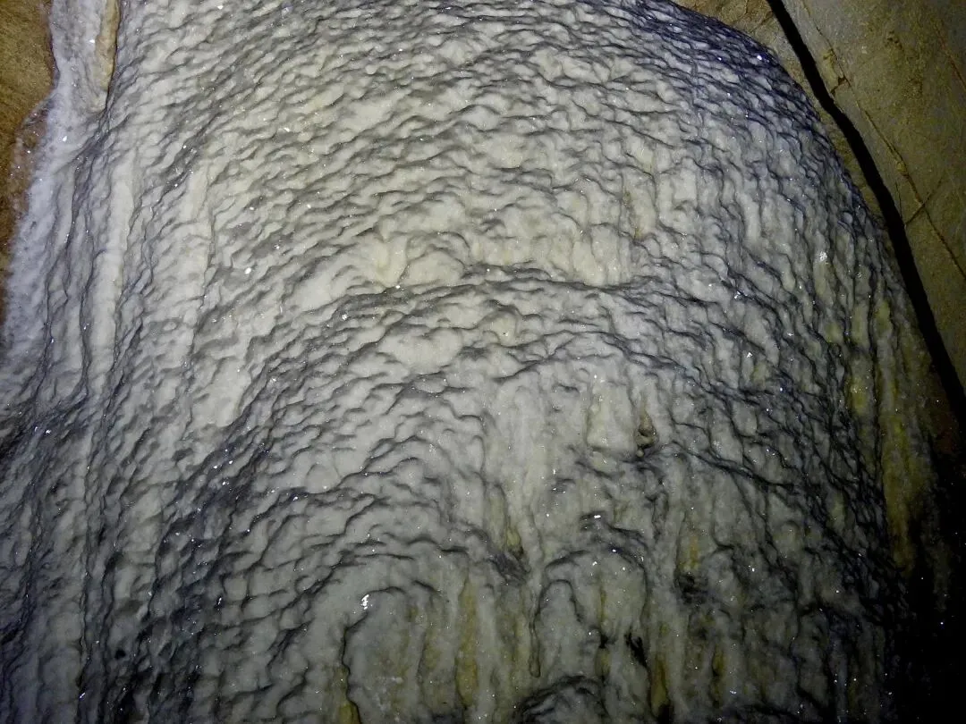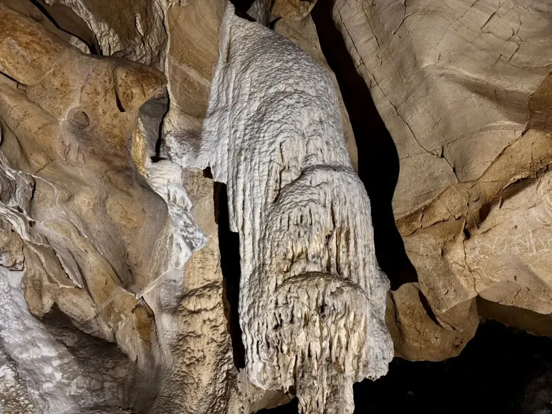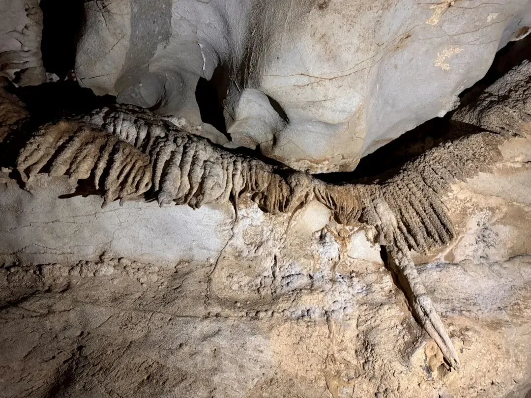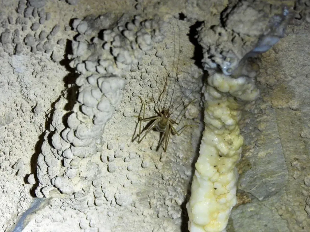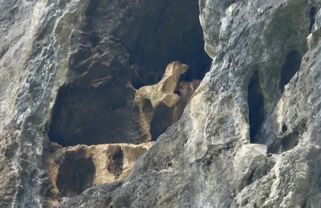 第一次抵达的最后的地方:第一次感觉要弯腰有点艰难就不去了。回来后问老板说弯腰进去后面还有200-300米。第二天想好好看看墙壁的奇石和一些流石,石幔之类的样子,走到第一次终点这里没留意竟然轻易就过去了。之后发现景色太漂亮没来过才发现已经走过这块弯腰的地段了,眼前闪出一大块发光的晶莹的白色的大流石瀑布.流石的形态和光泽是判断溶洞是否仍有活跃水流的重要标志之一,也是极具观赏价值的地质奇观。溶洞上方的地下水溶解了石灰岩中的碳酸钙,形成碳酸氢钙溶液。当水流沿洞壁流下时,压力降低、水分蒸发,碳酸氢钙分解,析出碳酸钙。碳酸钙逐层沉积,日积月累就形成了这种层叠的流石结构。第二次越过第一次的终点一点路走到这块闪光的大流石返回.路线比较熟悉返回的比较快。这个喀斯特地貌古溶洞太神奇了。第二天拍的第一天终点处:对比照片后确认是一个地方.一大堆晶莹闪光的白色流石,像白色流下的钻石瀑布,好漂亮!就是这一堆!这些溶洞里的石幔与流石,不是一朝一夕的偶然,而是亿万吨缓慢穿行的地下水,裹挟着石灰岩,以每百年仅长一点点的长度,在黑暗中沉默堆积,历经数十万乃至上百万年的漫长雕琢,日复一日,年复一年,成了大地最沉默、最漫长的精品作品。第二次终点就走到这里了. 感觉再进去怕有岔路,差不多该看的也都仔细看到了。再进去怕不好分辨方向,也没有头盔和头灯。原路返回。标准生长速度(全球溶洞通用)最常见的钟乳石、石幔、流石:平均 100 年 生长 0.1~1 厘米水质纯净、水流稳定的优质环境:最快 100 年长 1~3 厘米水流快、杂质多的地方:100 年连 0.1 厘米都长不到后来发现山崖上有很多洞洞,估计里面有大部分是空的洞腔。👇🏻都是山崖峭壁上的洞口形状这个洞大概率是进来水道上方透光的洞的入口里面有钟乳石。哇!这块石头太像小狗了!如果山崖上方的的溶洞能进去,估计也是内部很多奇观.只是无法进去。 综合上面的信息,我感觉山体内有很多远古的溶洞。当然这个也是此种地质正常的特点。如果我会飞,就可以上去看看。漫山遍野的藿香蓟-菊科藿香蓟属的一年生草本植物,是云南野外极为常见的野生花卉。原产于热带美洲,现广泛归化于我国云南、广东、广西等南方地区,是云南山野中最常见的野生草本花卉之一。 适应能力极强,能在多种土壤环境中生长,成片分布形成紫色花海。