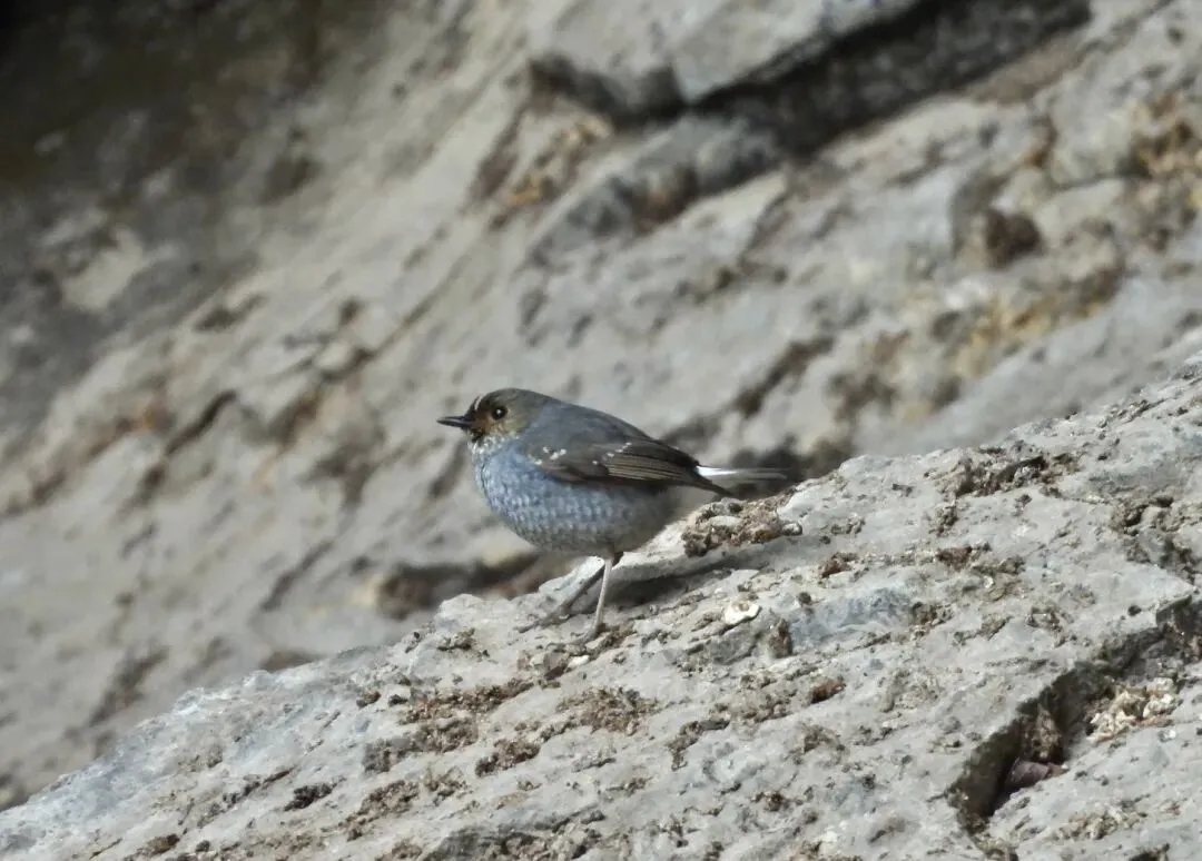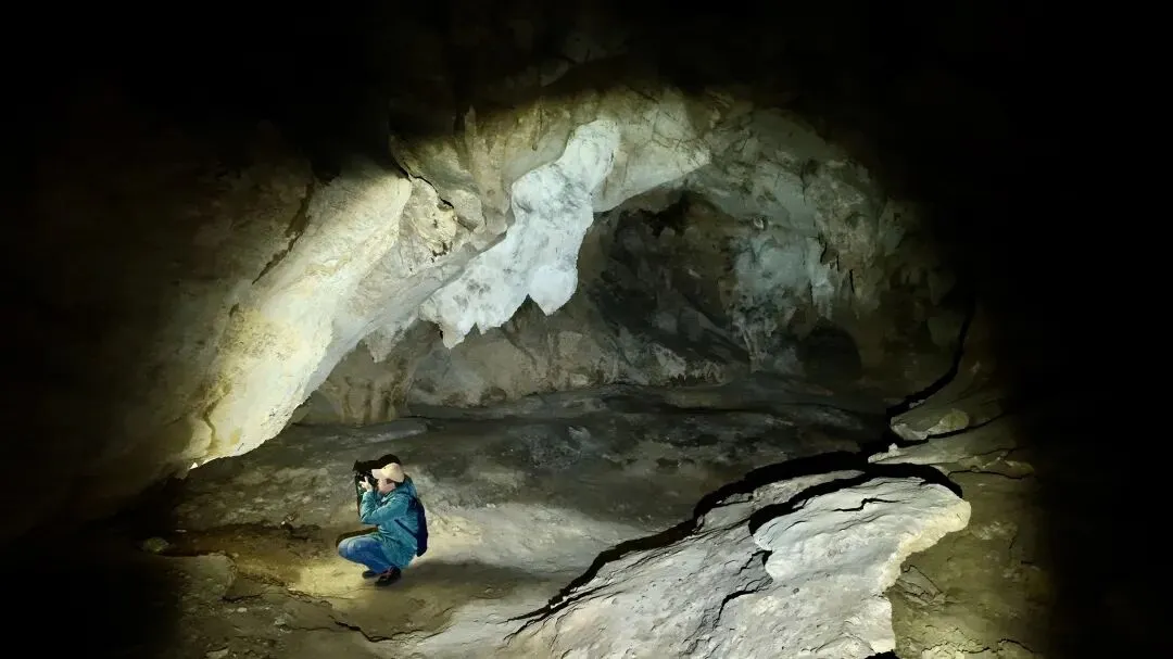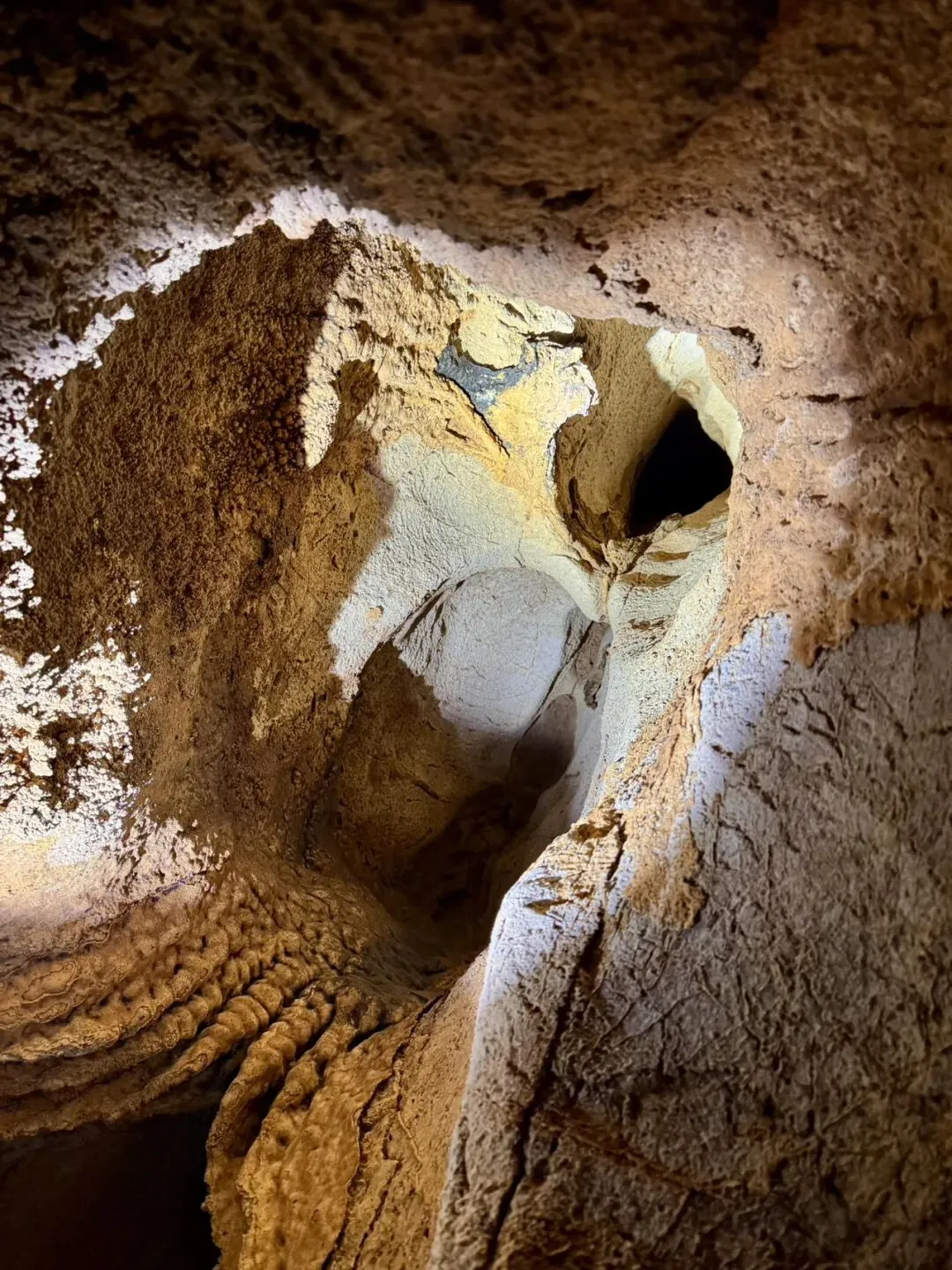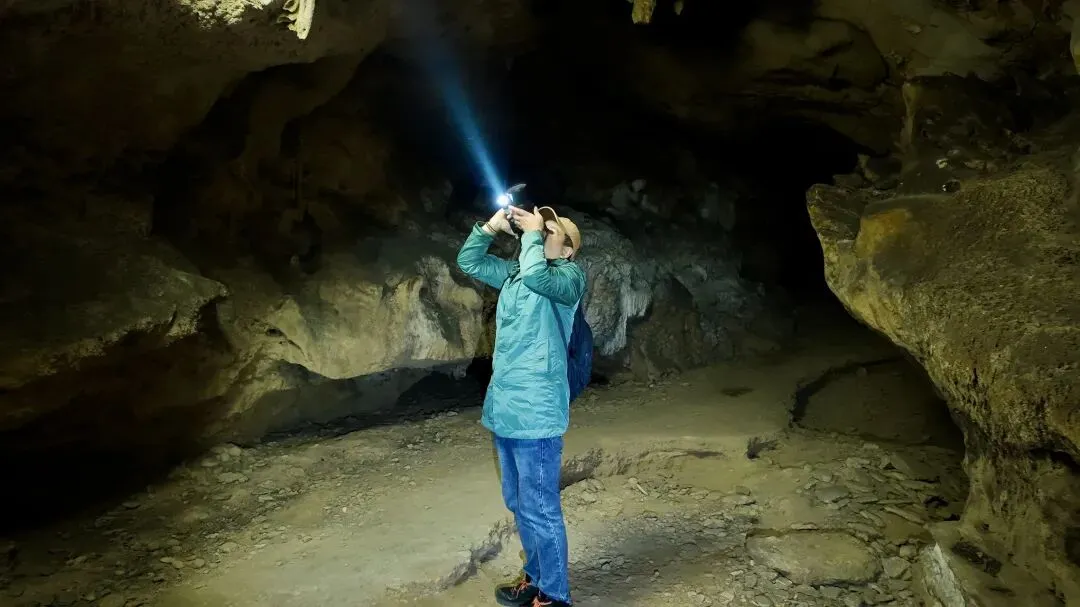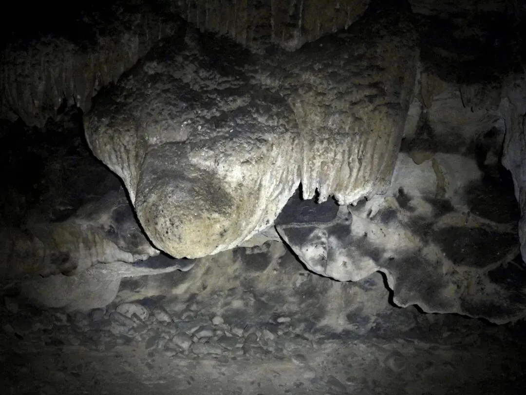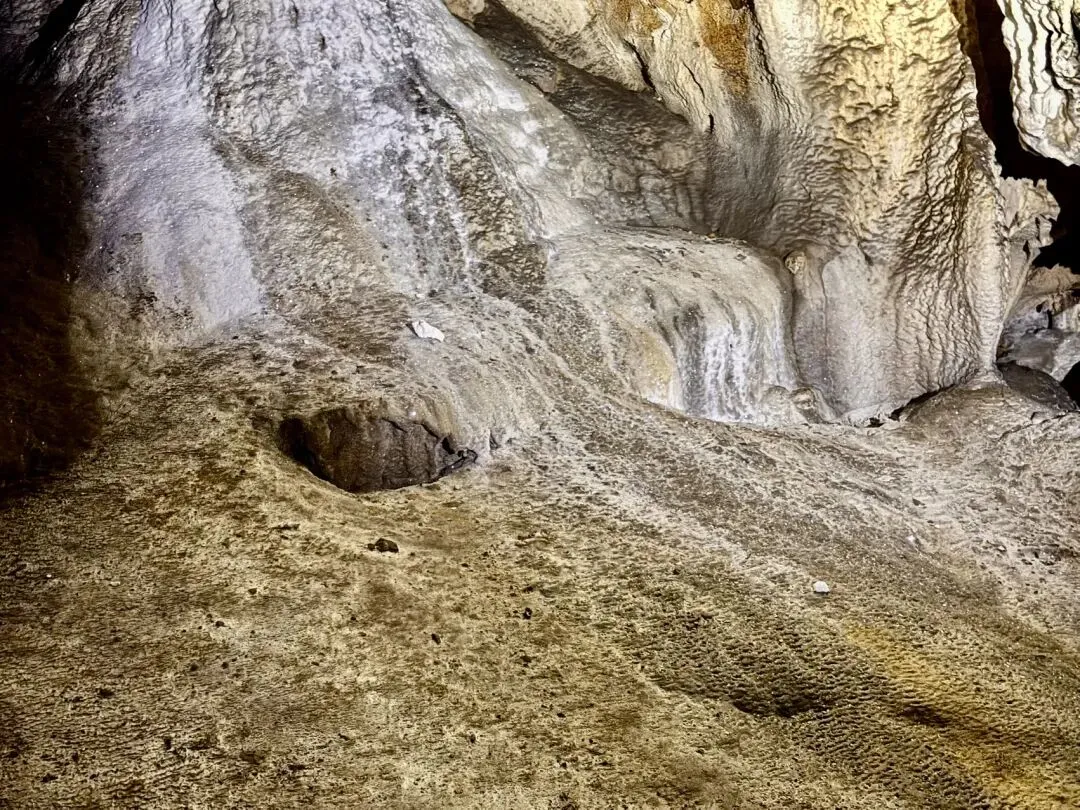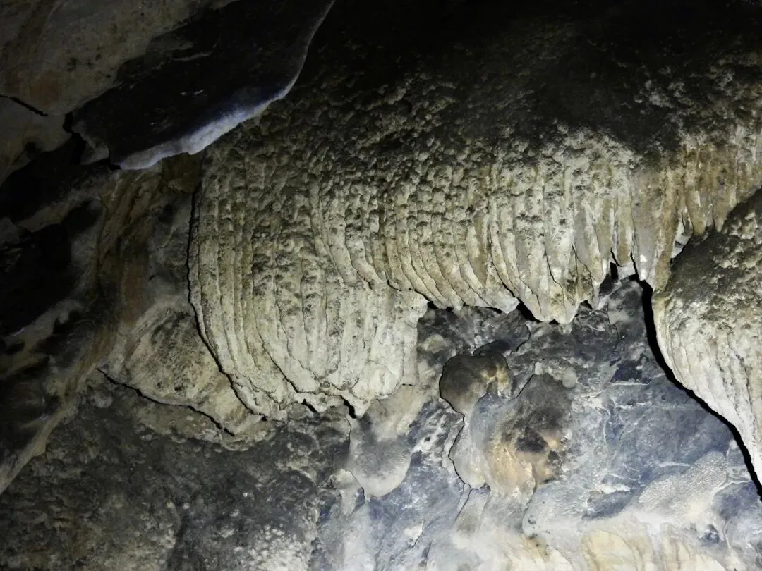 第一次抵达的最后的地方:第一次感觉要弯腰有点艰难就不去了。回来后问老板说弯腰进去后面还有200-300米。第二天想好好看看墙壁的奇石和一些流石,石幔之类的样子,走到第一次终点这里没留意竟然轻易就过去了。之后发现景色太漂亮没来过才发现已经走过这块弯腰的地段了,眼前闪出一大块发光的晶莹的白色的大流石瀑布.流石的形态和光泽是判断溶洞是否仍有活跃水流的重要标志之一,也是极具观赏价值的地质奇观。溶洞上方的地下水溶解了石灰岩中的碳酸钙,形成碳酸氢钙溶液。当水流沿洞壁流下时,压力降低、水分蒸发,碳酸氢钙分解,析出碳酸钙。碳酸钙逐层沉积,日积月累就形成了这种层叠的流石结构。第二次越过第一次的终点一点路走到这块闪光的大流石返回.路线比较熟悉返回的比较快。这个喀斯特地貌古溶洞太神奇了。第二天拍的第一天终点处:对比照片后确认是一个地方.一大堆晶莹闪光的白色流石,像白色流下的钻石瀑布,好漂亮!就是这一堆!这些溶洞里的石幔与流石,不是一朝一夕的偶然,而是亿万吨缓慢穿行的地下水,裹挟着石灰岩,以每百年仅长一点点的长度,在黑暗中沉默堆积,历经数十万乃至上百万年的漫长雕琢,日复一日,年复一年,成了大地最沉默、最漫长的精品作品。第二次终点就走到这里了. 感觉再进去怕有岔路,差不多该看的也都仔细看到了。再进去怕不好分辨方向,也没有头盔和头灯。原路返回。标准生长速度(全球溶洞通用)最常见的钟乳石、石幔、流石:平均 100 年 生长 0.1~1 厘米水质纯净、水流稳定的优质环境:最快 100 年长 1~3 厘米水流快、杂质多的地方:100 年连 0.1 厘米都长不到后来发现山崖上有很多洞洞,估计里面有大部分是空的洞腔。👇🏻都是山崖峭壁上的洞口形状这个洞大概率是进来水道上方透光的洞的入口里面有钟乳石。哇!这块石头太像小狗了!如果山崖上方的的溶洞能进去,估计也是内部很多奇观.只是无法进去。 综合上面的信息,我感觉山体内有很多远古的溶洞。当然这个也是此种地质正常的特点。如果我会飞,就可以上去看看。漫山遍野的藿香蓟-菊科藿香蓟属的一年生草本植物,是云南野外极为常见的野生花卉。原产于热带美洲,现广泛归化于我国云南、广东、广西等南方地区,是云南山野中最常见的野生草本花卉之一。 适应能力极强,能在多种土壤环境中生长,成片分布形成紫色花海。
