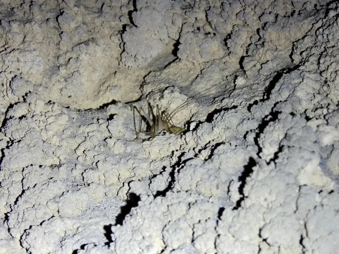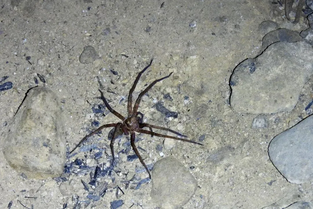空间宽敞的蟹蛛-被电筒光吓得躲到石头下面了。还有一只大蚰蜒,直接溜走了。