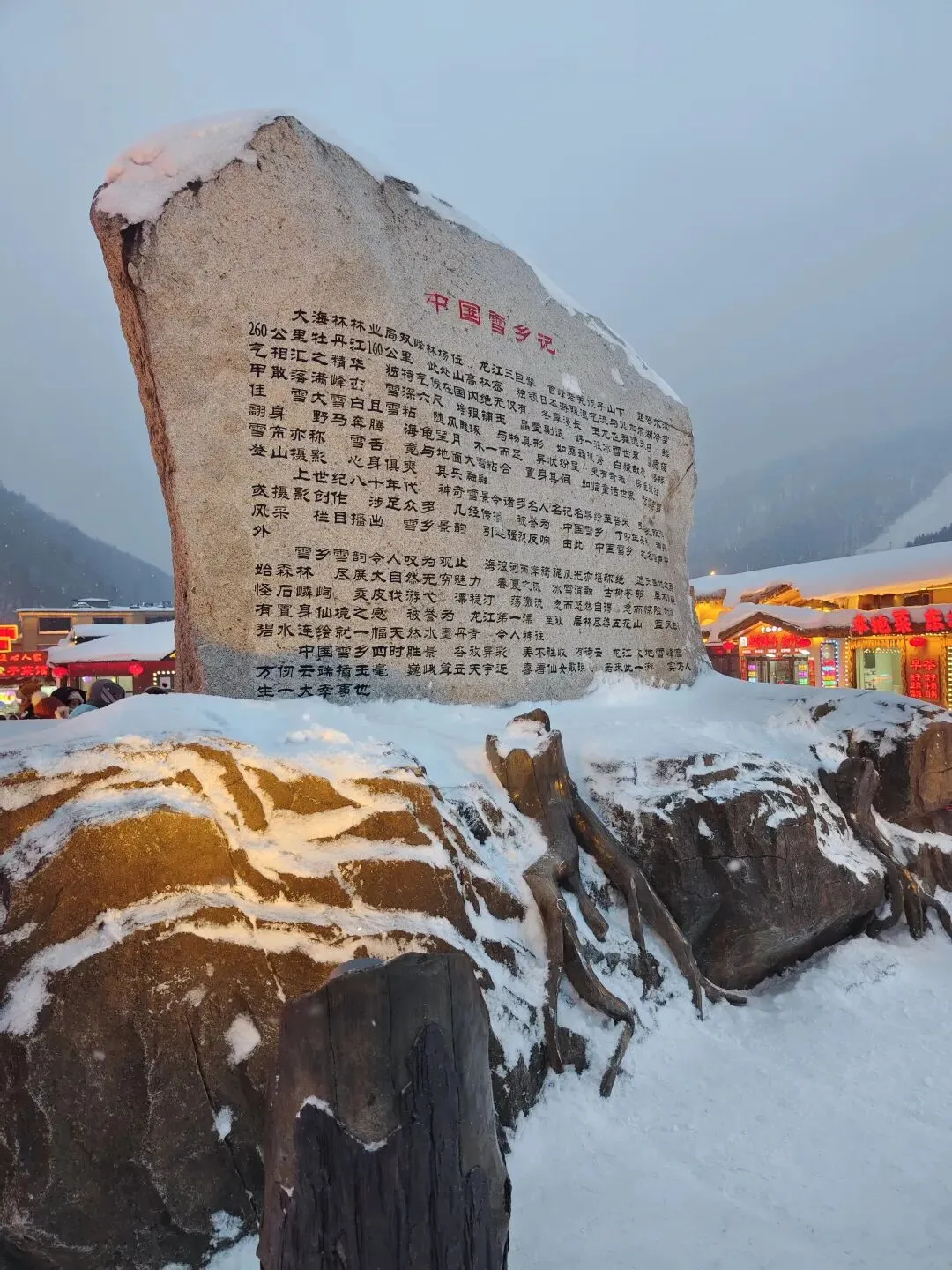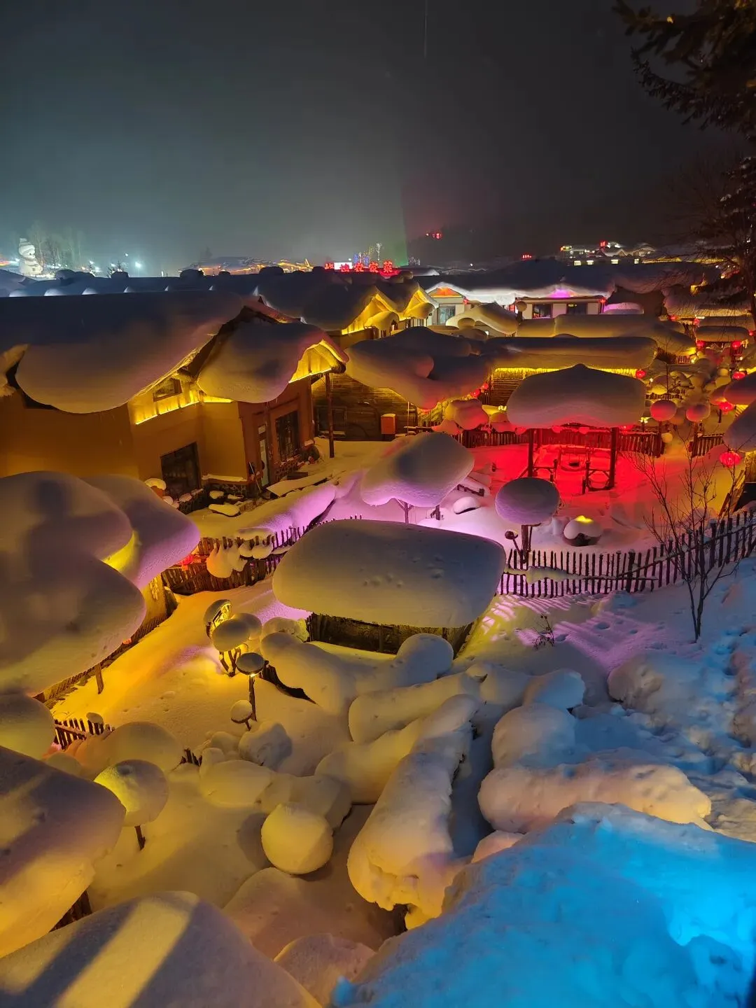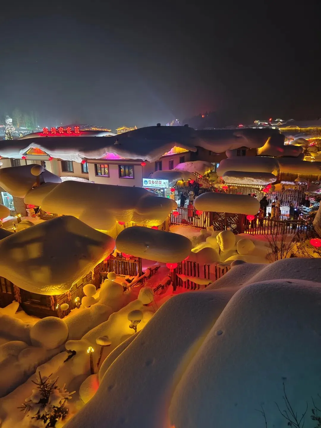晚上赶到了雪乡,雪乡才是重点,可以在童话小镇的门牌进去后,爬到了楼梯上,拍照打卡,那个景的确很美,很像童话世界一样梦幻。这才是雪乡的重点,之后就广场上野外蹦迪,在户外零下十几度蹦迪,也是不错的体验。之后在原地看5分钟的烟花,就赶去看雪乡情景剧,那个还不错。之后就慢慢逛雪乡,花两个小时左右就逛完了。雪乡还是值得去的。如果去雪乡拍写真,记得货比三家,看看摄影师水平如何,我那家实在是太一般了,还不如我自己手机拍。那图,我是拿回底片自己回去修的。我想要的是写真照,他拍成了旅客照,相当无语😓。