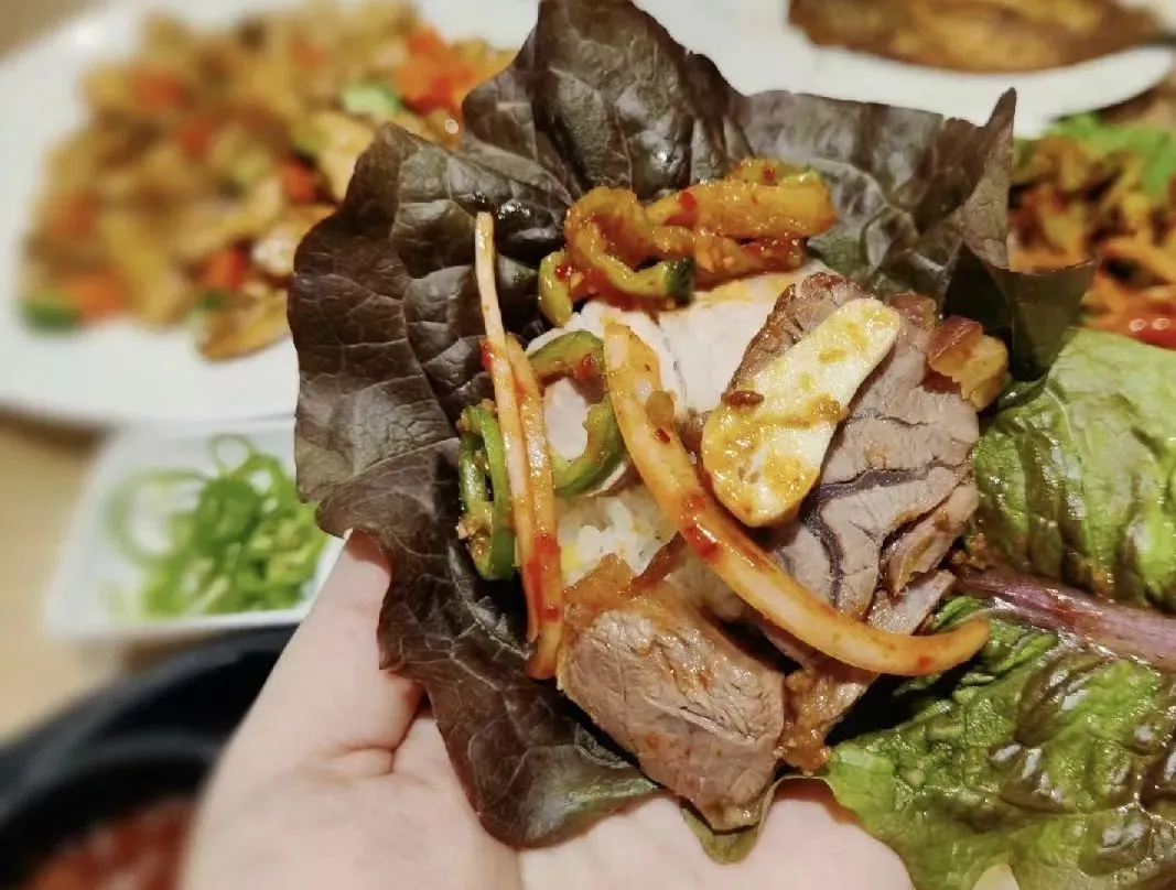 包饭:独具特色的套餐形式,包含了多种蔬菜(生菜、苏子叶、大头菜叶等)、肉片(五花肉、肘子肉常见)、泡菜、酱料以及米饭。把肉片、米饭和喜欢的配菜用菜叶包起来,一口咬下去,肉质的香美与蔬菜的清爽在口中交织,层次丰富,越嚼越香。