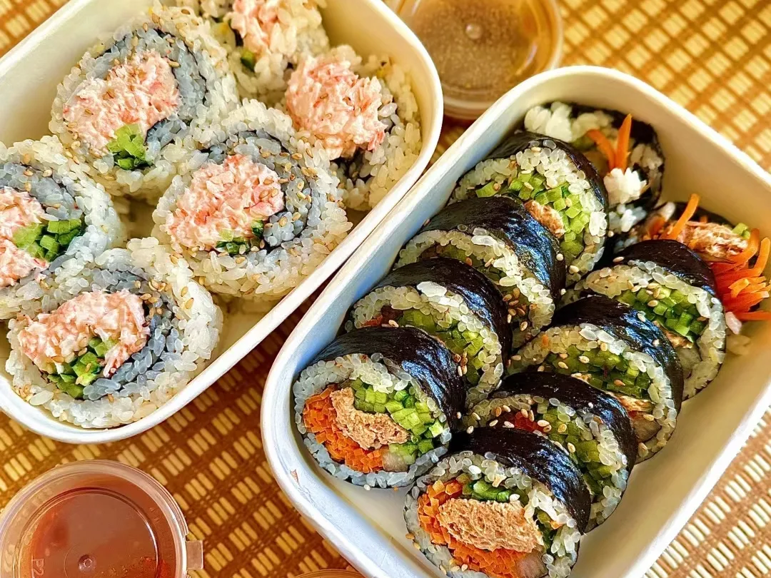 紫菜饭:常见做法是用紫菜将煮熟的米饭与蔬菜(黄瓜、胡萝卜等)、肉类或鸡蛋卷等包卷起来,制作简单,方便携带,是延吉街头随处可见的实惠美食,无论是作为早餐还是外出野餐的干粮都超合适。