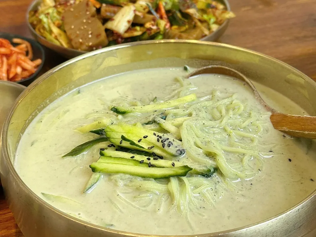 豆浆面:延吉极具特色的凉面之一,以浓郁的豆浆为汤底,面条多选用筋道的荞麦面或小麦面。豆浆经过精心熬制,口感醇厚顺滑,带着淡淡的豆香,汤底通常会冰镇得冰凉。碗中还会搭配辣白菜、黄瓜丝、煮鸡蛋等配菜,有的还会撒上少许芝麻增香。