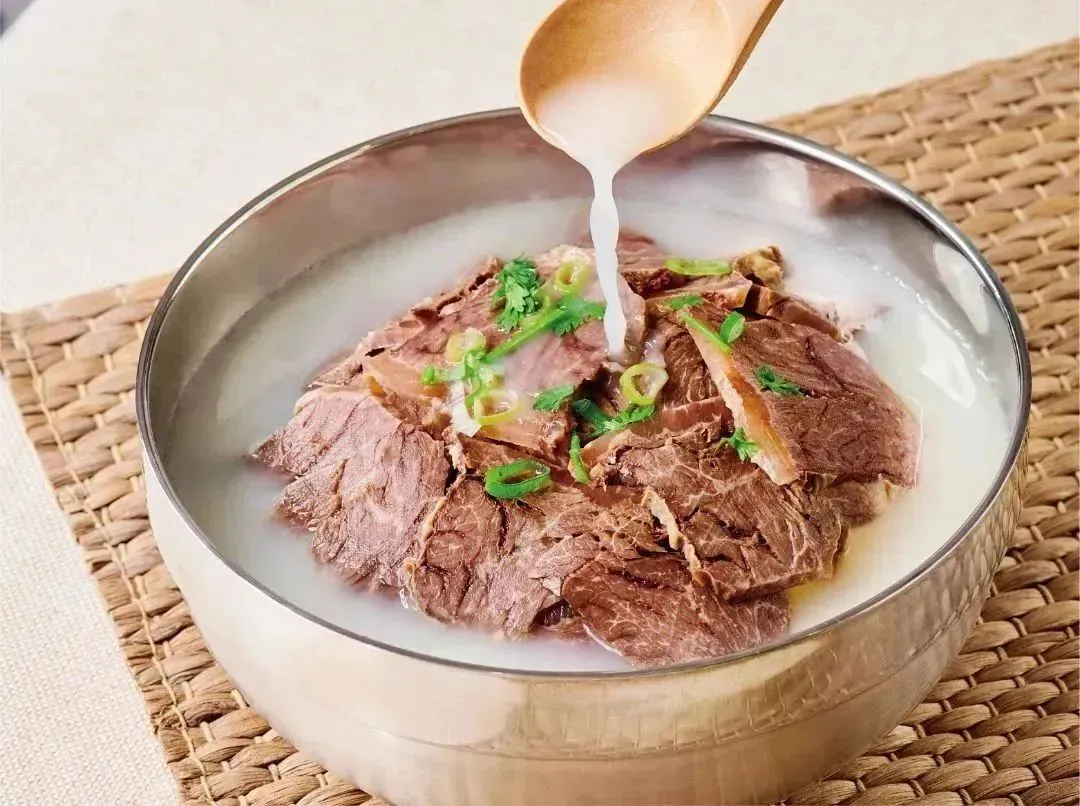 牛肉汤:看似简单的牛肉与水的组合,却被延吉人做出了多种花样。选用不同部位的牛肉(手撕肉、带皮肉等)熬制出不同风味的汤品,再加上家家特制的牛肉辣酱,不仅丰富了汤的味道,还增添了食欲,搭配一碗米饭,让人吃得满足又舒心。