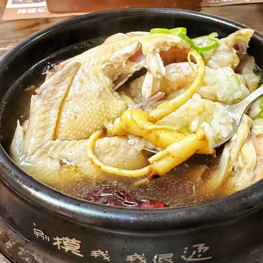 参鸡汤:极具延吉特色的滋补名汤,将鸡肉与糯米、红枣、枸杞、人参等食材一同炖煮。鸡肉炖得软烂,筷子轻轻一夹骨肉分离,汤鲜肉烂,咸香微辣,带有浓郁的药膳味。鸡肚里浸透汤汁的糯米软糯可口,营养丰富,四季皆可食用。