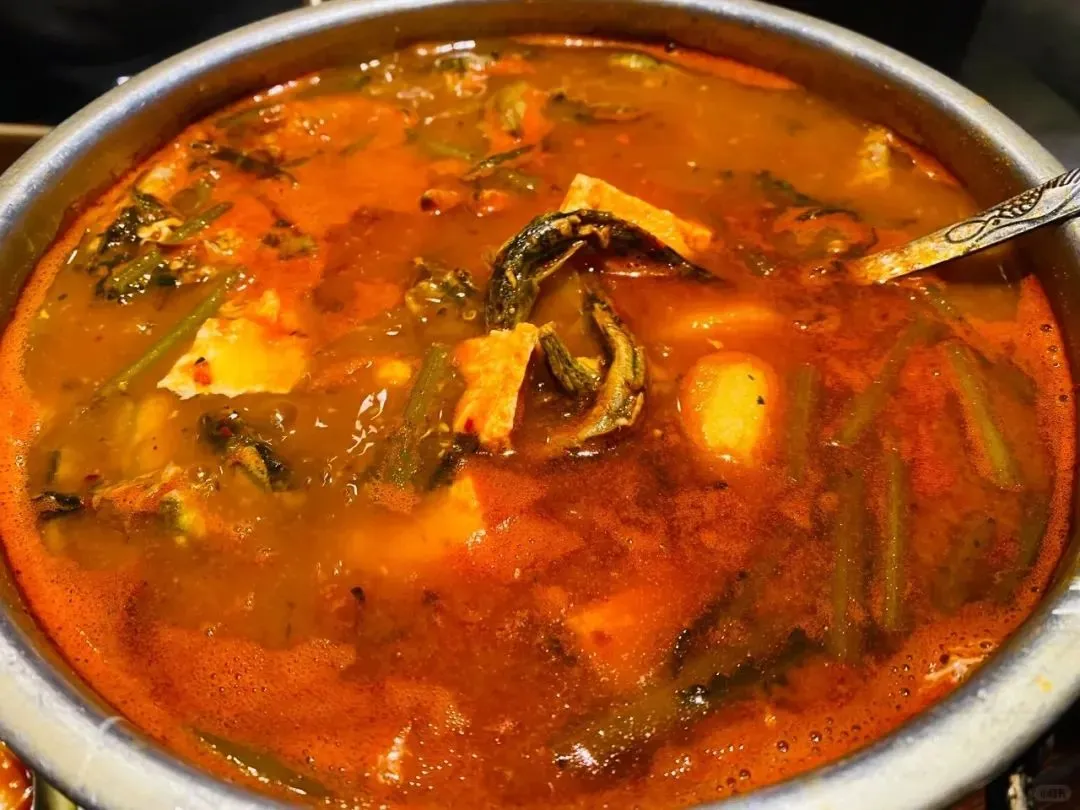 酱汤:朝鲜族餐桌上不可或缺的美食。大多用自家制作的黄豆酱作为汤底,搭配五花肉、豆腐、洋葱、角瓜、青椒等基本食材,还可根据个人喜好加入金针菇、粉丝、海带等。炖煮出来的酱汤,味道浓郁醇厚,香气扑鼻,用来泡饭简直绝配,温暖又开胃。