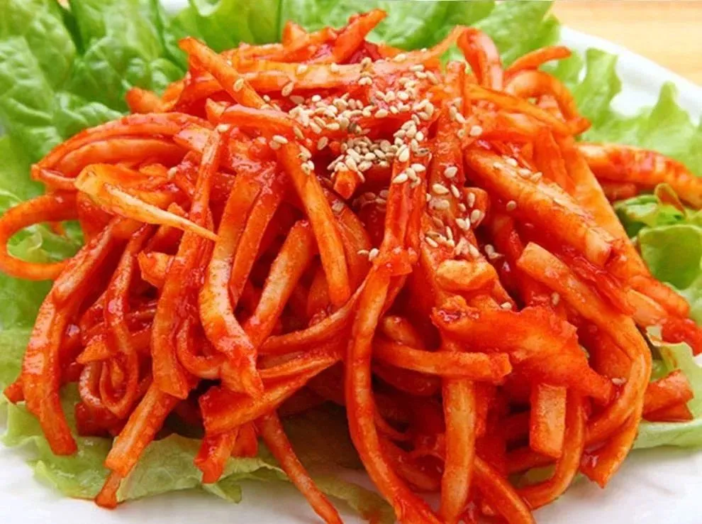 拌桔梗:桔梗经过处理后,口感爽脆,味道甜辣,一口下去,甜辣的味道在口中散开,十分过瘾。