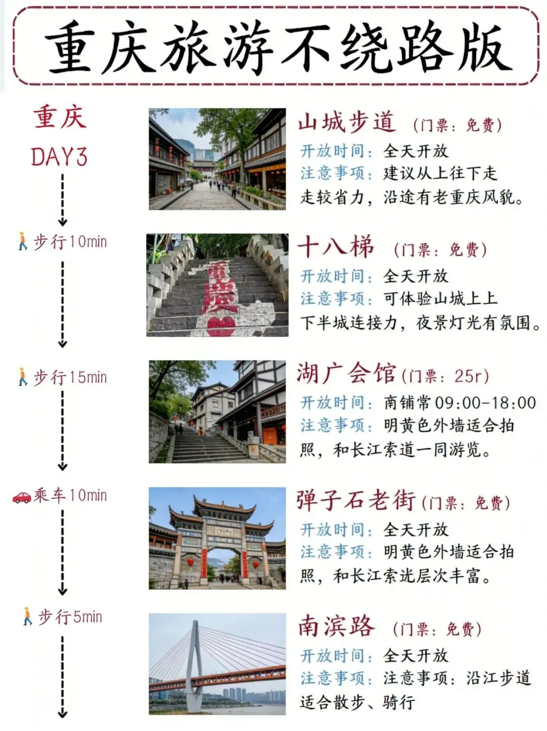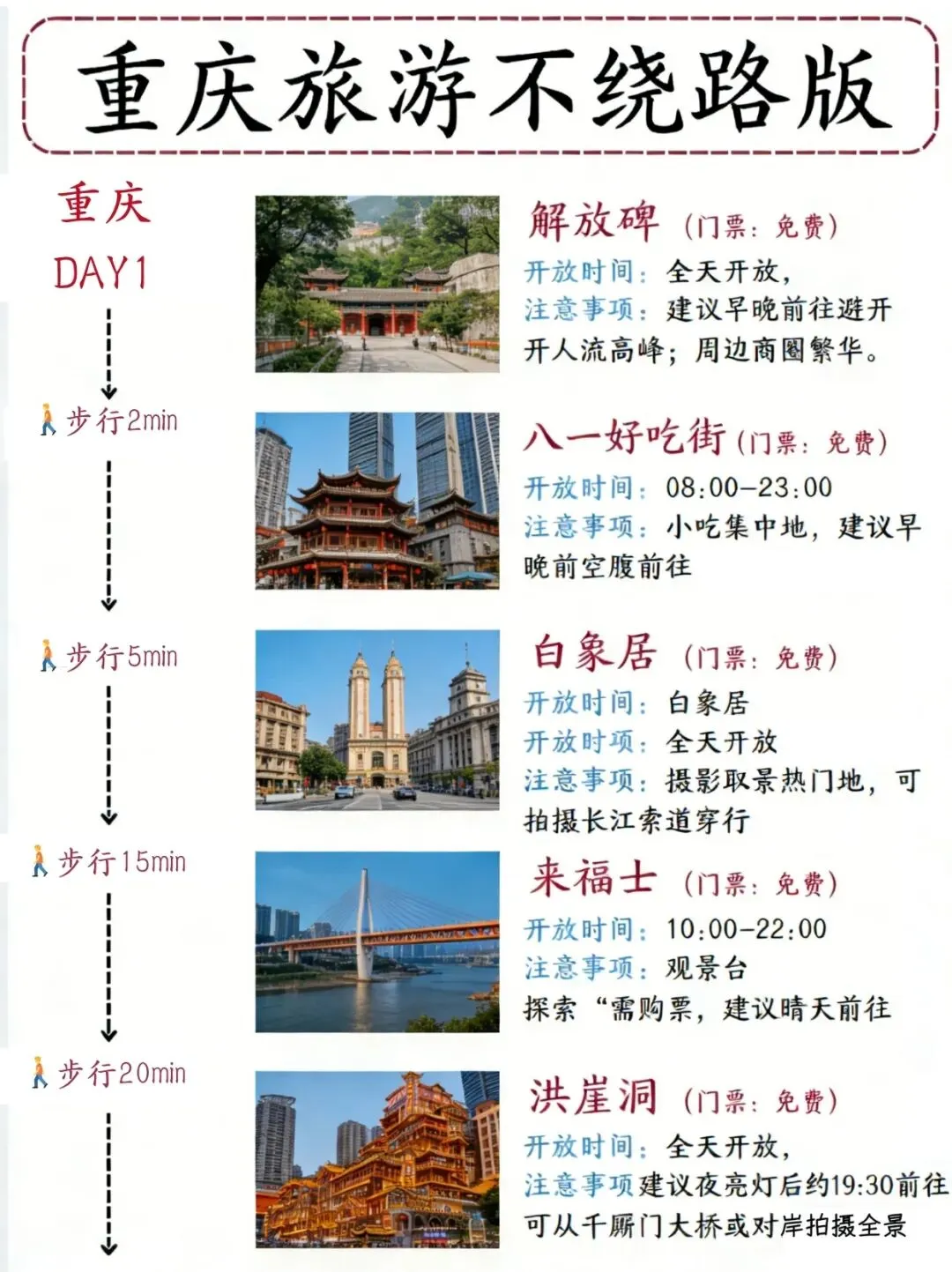 🌉 洪崖洞:亮灯时间19:00-23:00,对面千厮门大桥或江滩拍照更出片