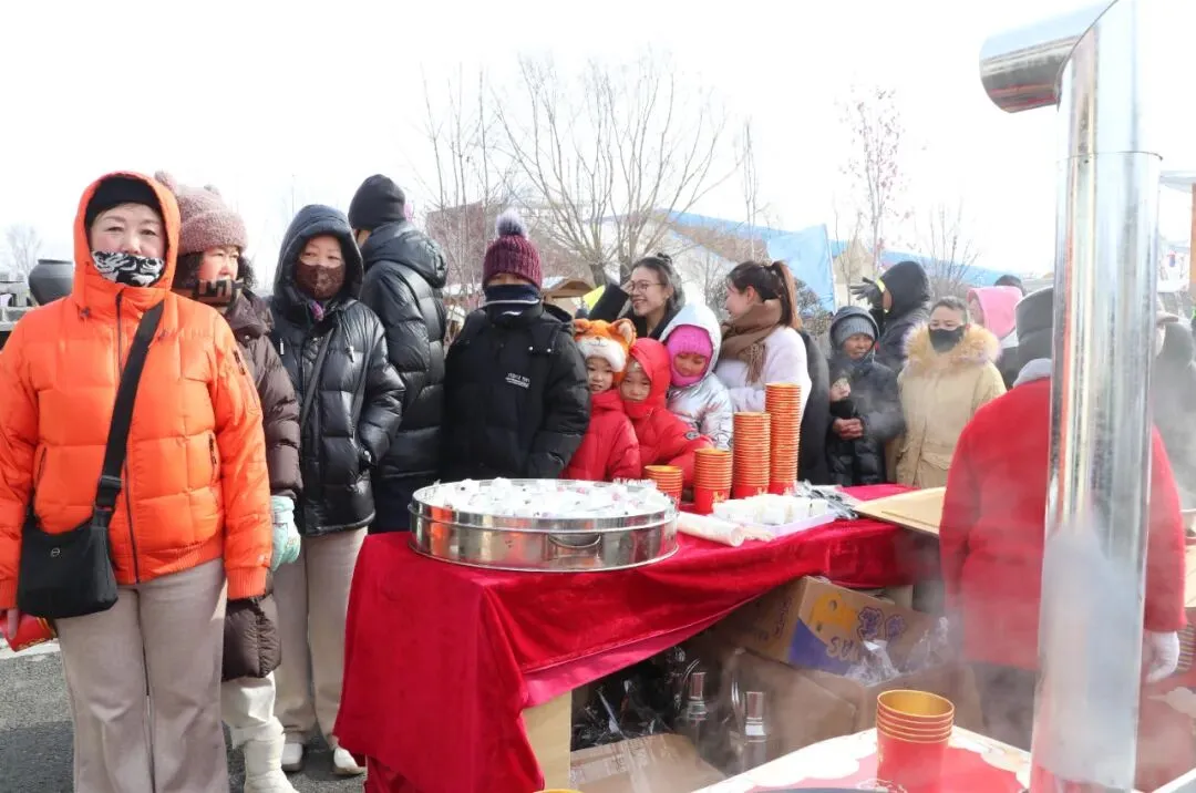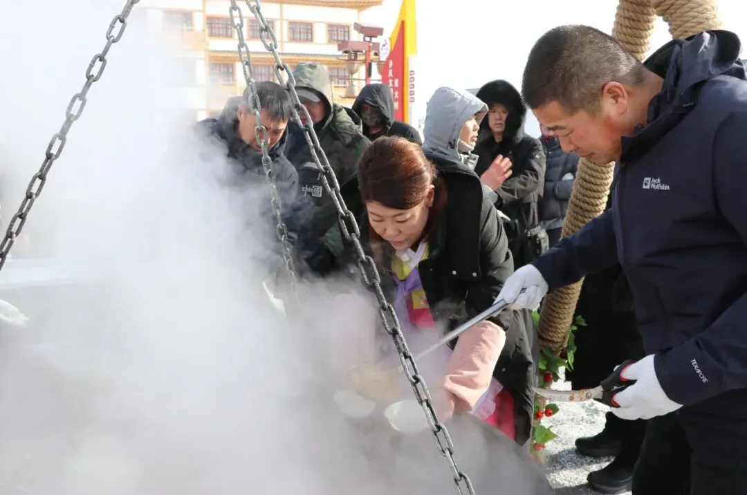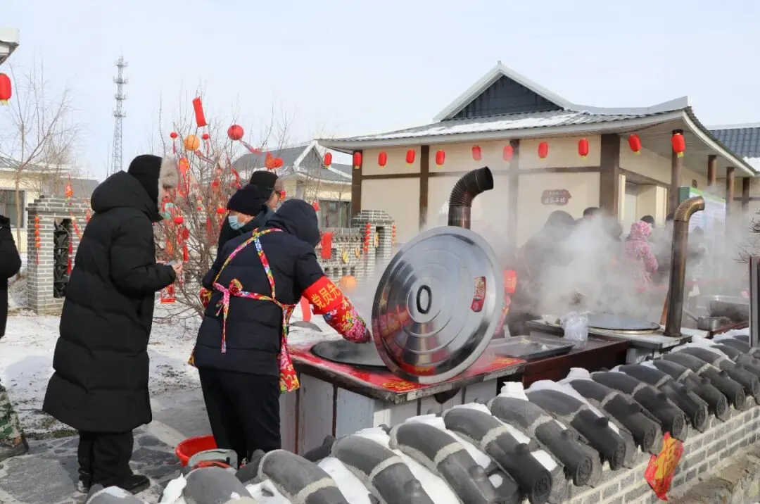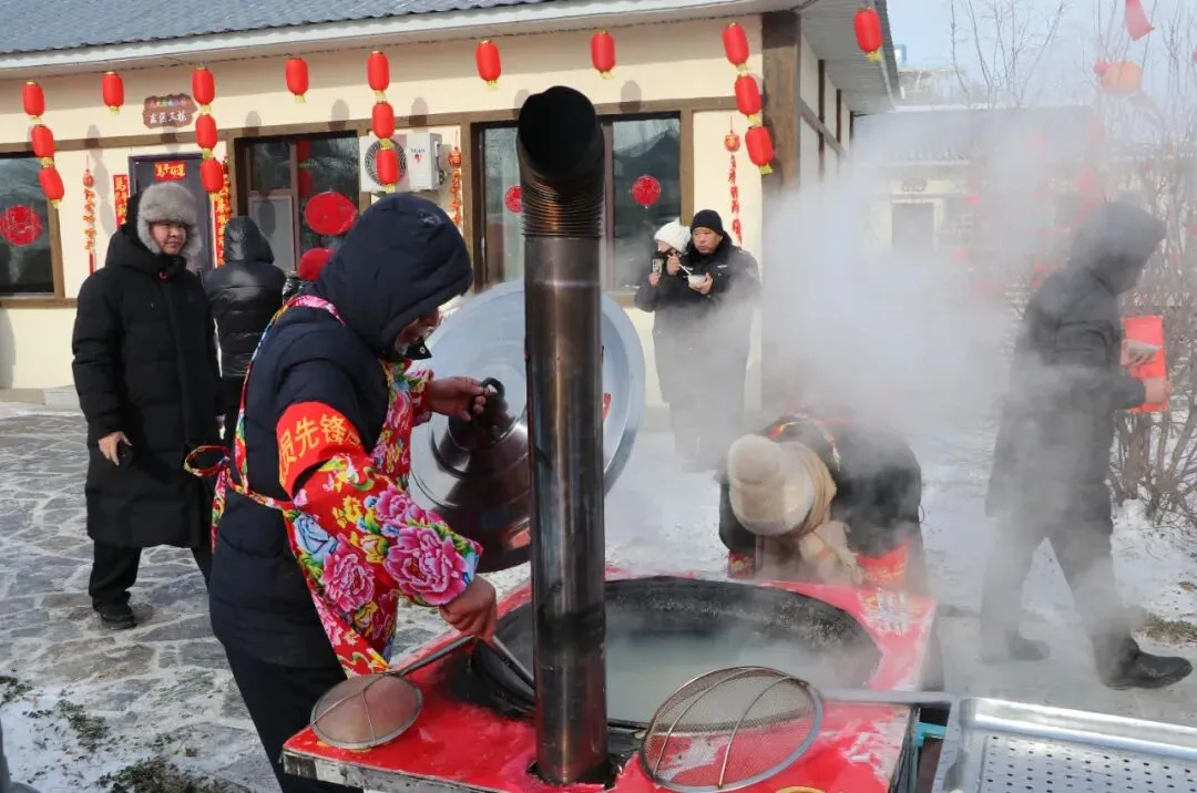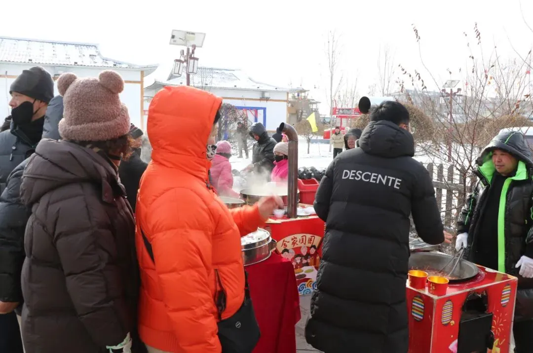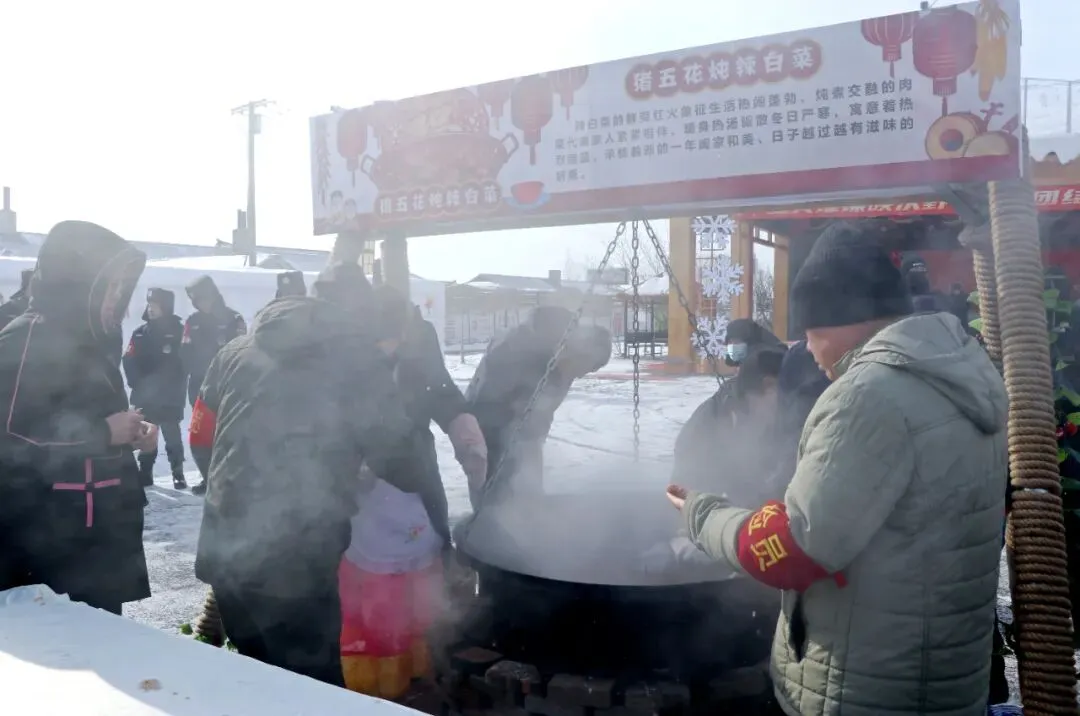 “共庆岁首·家宴寻味”环节串联星火民宿与村委会广场,年味氛围浓厚。从雪乐园到星火民宿沿途设置打卡牌,循环播放朝鲜族传统音乐,现场氛围感拉满。民宿推出山林融合、朝鲜族正统双主题岁首家宴,展陈山特产品、讲解岁首礼仪,提供免费试吃、许愿祈福、团圆合影等服务,游客可参与摆桌、学跳朝鲜族舞蹈。村委会广场上,大锅熬制朝鲜族五花肉炖辣白菜,上下午各一锅供游客免费品尝,大舞台还上演互动歌舞表演,演员与游客同台欢歌,在美食与欢舞中传递团圆喜悦,共庆岁首佳节。