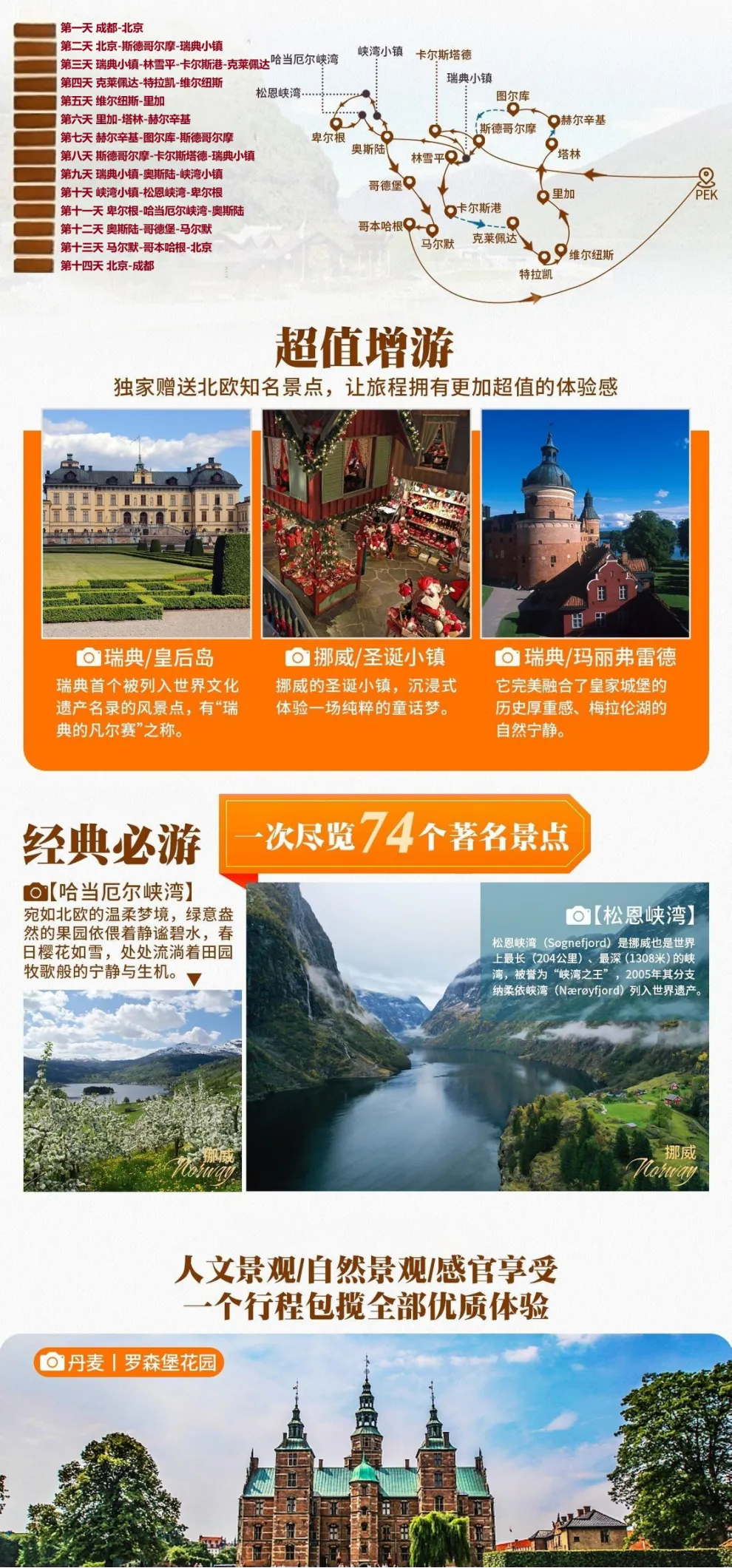 👍特色景点:赫尔辛基颂歌中央图书馆、皇后岛、斯德哥尔摩市政厅、瓦萨沉船博物馆、斯德哥尔摩地铁、玛丽弗雷德、维格兰雕塑公园、弗洛姆高山小火车、FLAM铁路博物馆、挪威圣诞小镇、哈当厄尔峡湾游船、玫瑰宫及花园、卑尔根、林雪平老城