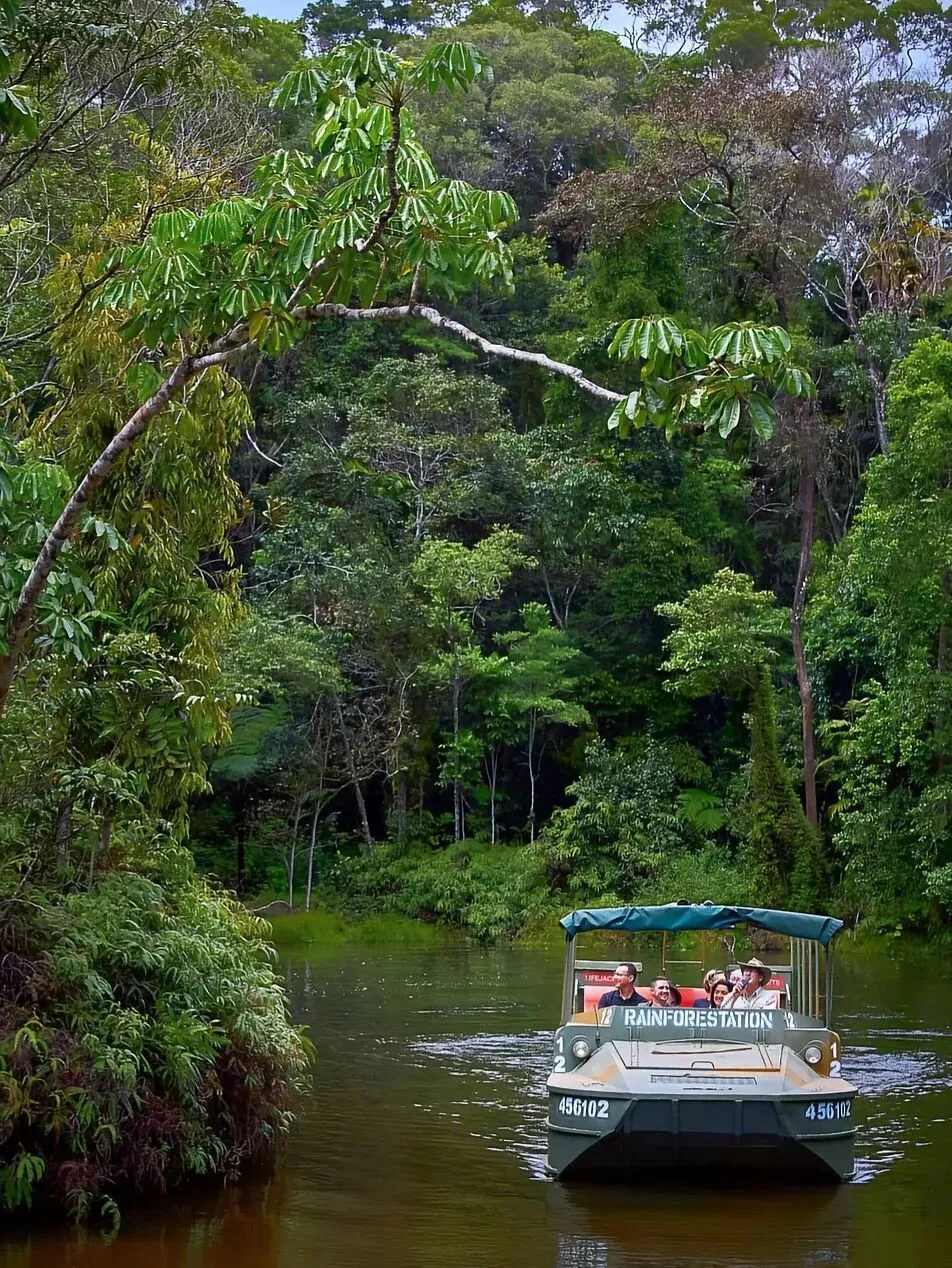 乘坐二战同款 DUKW 水陆两用车穿梭雨林深处,这款车原本是二战时用于登陆作战的,现在改装后用于雨林探险,车轮一换就能下水,溅起的水花打在脸上凉丝丝的(建议带个小毛巾)。沿途能看到各种珍奇动植物,比如会发光的菌类、颜色鲜艳的毒箭蛙(导游说有毒,只能看不能摸),还能在露天剧场看土著人的飞镖表演和传统舞蹈 —— 土著小哥手持木质飞镖,能精准投进 10 米外的树干,力道超足,我还跟着学了简单的舞蹈动作,虽然动作不标准,但超开心。最后在雨林里吃一顿澳式 BBQ,烤羊排外焦里嫩,搭配着热带水果(百香果、芒果、莲雾),清爽又解腻,还有袋鼠肉肠可以尝试,口感有点像牛肉,带着淡淡的香料味。