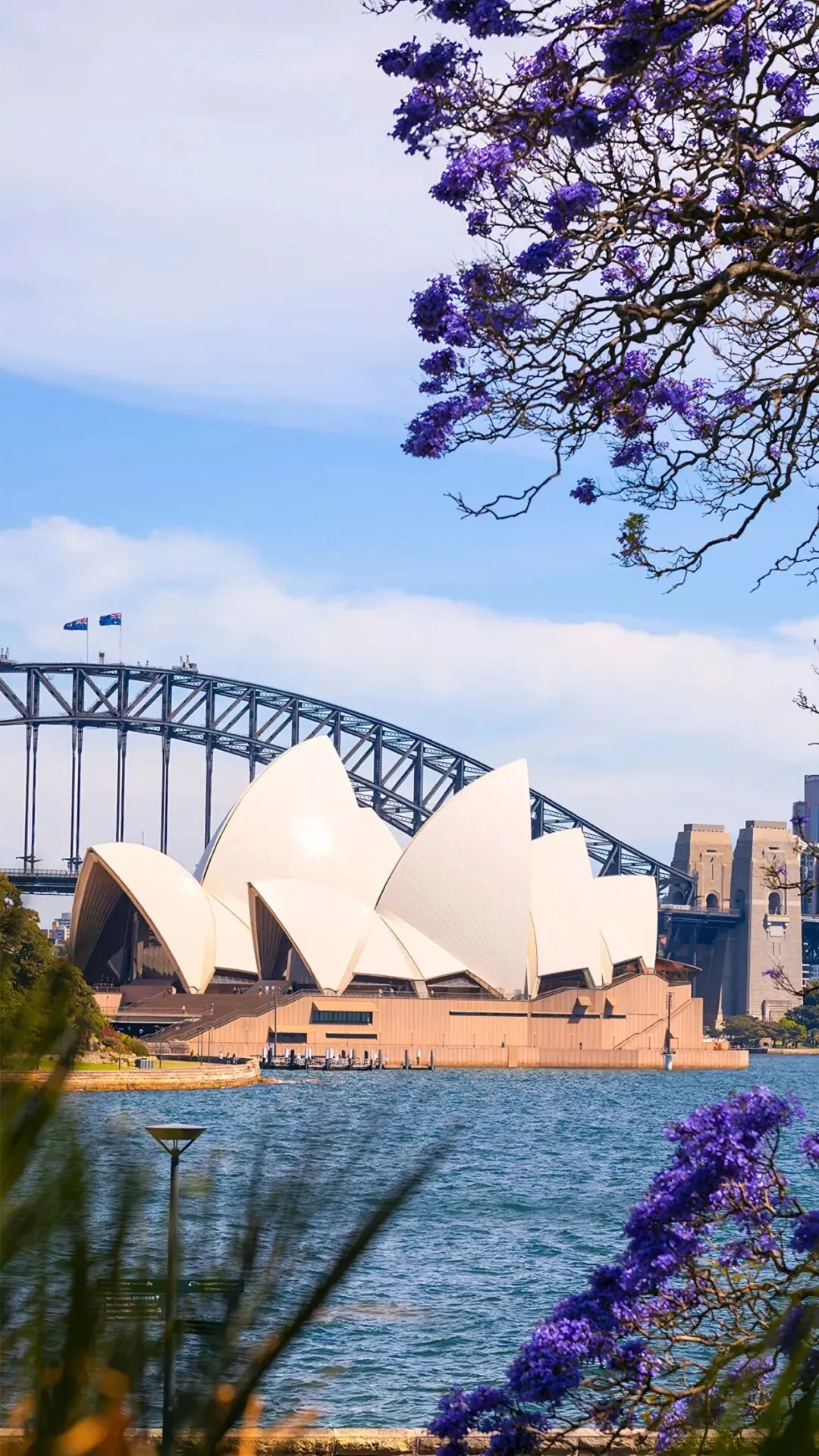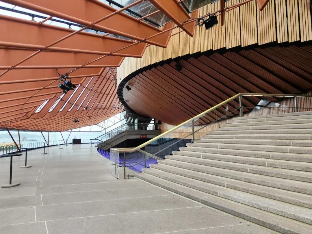 以前总在外面拍照,这次终于走进内部。30 分钟的中文讲解太有用了,原来贝壳造型的屋顶藏着这么多建筑玄机 —— 每个贝壳都是由混凝土浇筑而成,表面贴了 600 多片瑞典产的白色釉面瓷砖,既能挡雨又能隔音;音乐厅的天花板像一个巨大的白色蘑菇,采用了声学扩散设计,不用麦克风,站在舞台中央说话,最后一排都能听得清清楚楚。站在观景台看悉尼港的海风拂过,远处的海港大桥与歌剧院同框,才算真正读懂这座建筑的魅力(建议穿浅色衣服拍照,和白色贝壳屋顶对比超强烈)。