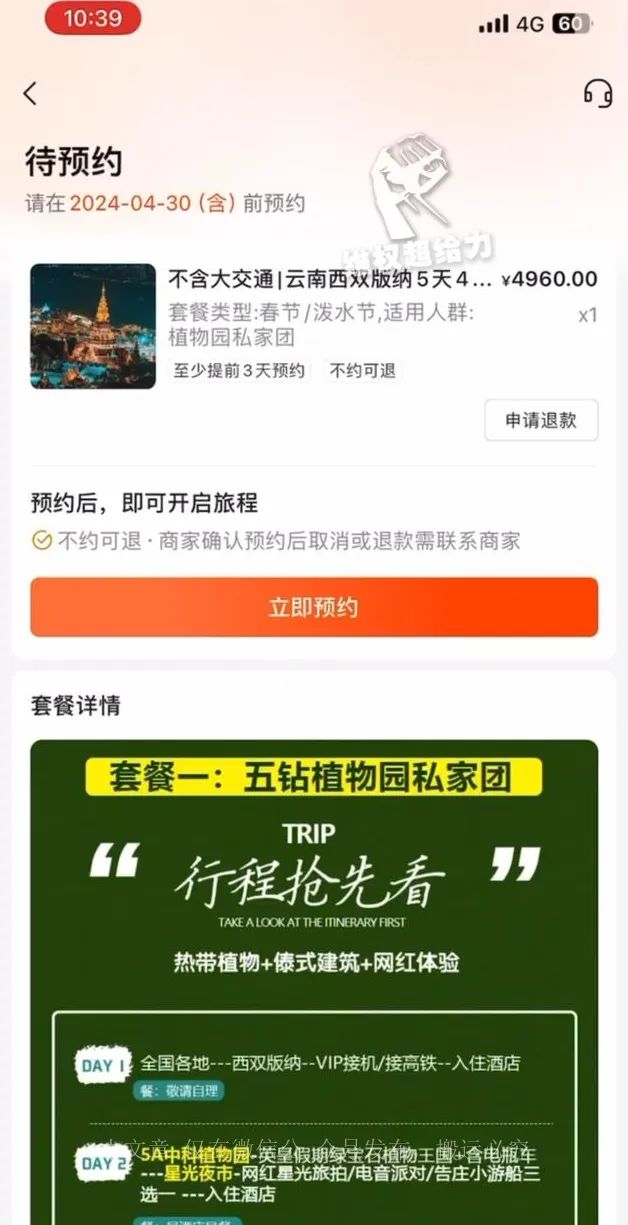 这起事件的主人公郑女士,原本期待着在春节期间前往西双版纳享受一段愉快的旅行。她选择了东方甄选平台提供的旅行团套餐,然而,她并没有意识到,尽管套餐页面上明确写明需要提前至少三天预约,但下单后还需要额外联系客服确认。