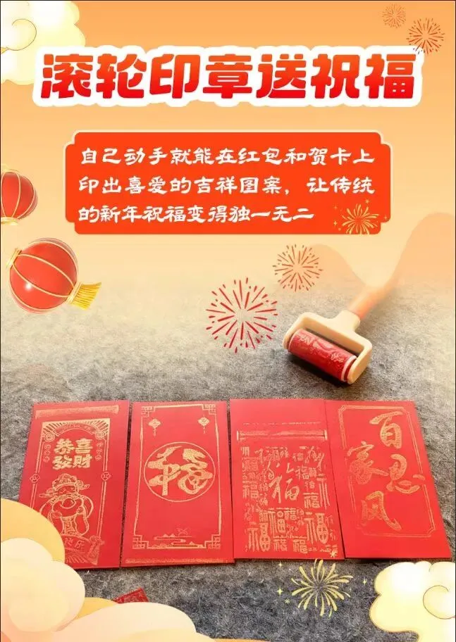 滚轮印章采用非遗滚筒拓印工艺,自己动手就能在红包和贺卡上印出喜爱的吉祥图案,让传统的新年祝福变得独一无二。
