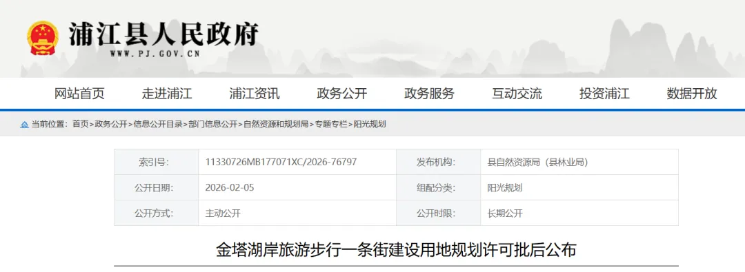 2月6日,浦江县自然资源和规划局发布了《金塔湖岸旅游步行一条街建设用地规划许可批后公布》,标志着这条位于金狮湖旁的特色旅游步行街正式进入规划落地阶段,离开工建设又近了一步。