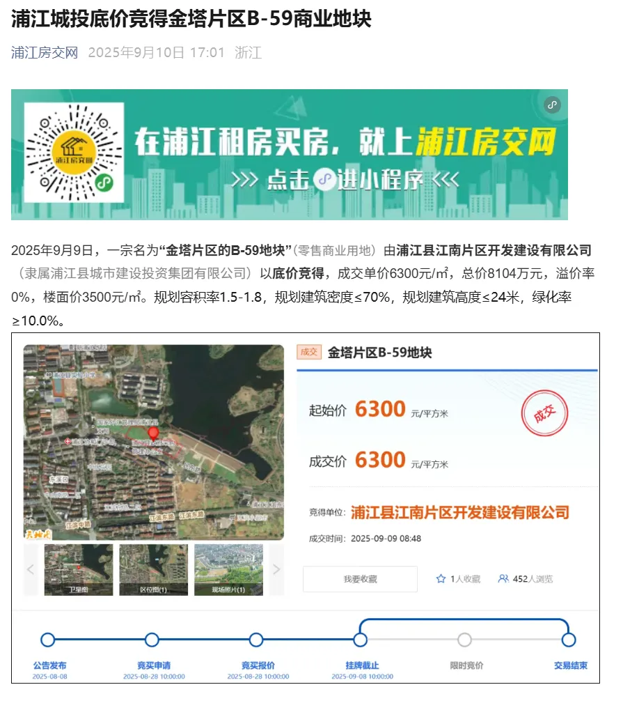 据了解,该地块早在2025年9月9日已顺利成交,由浦江城投旗下公司以底价竞得。成交单价6300元/㎡,总价8104万元。规划容积率1.5-1.8,规划用途:商业用地/商务金融用地。