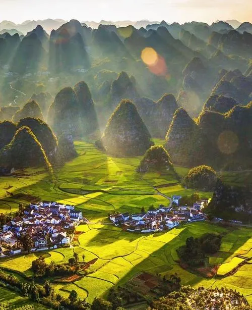 万峰林的田野已经带了春意,八卦田的油菜花开得刚好。骑行或坐观光车都行,傍晚的光线最适合拍照。