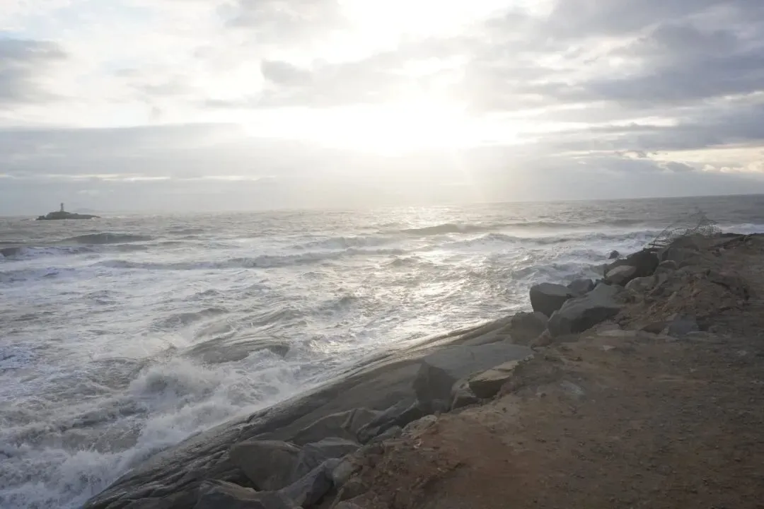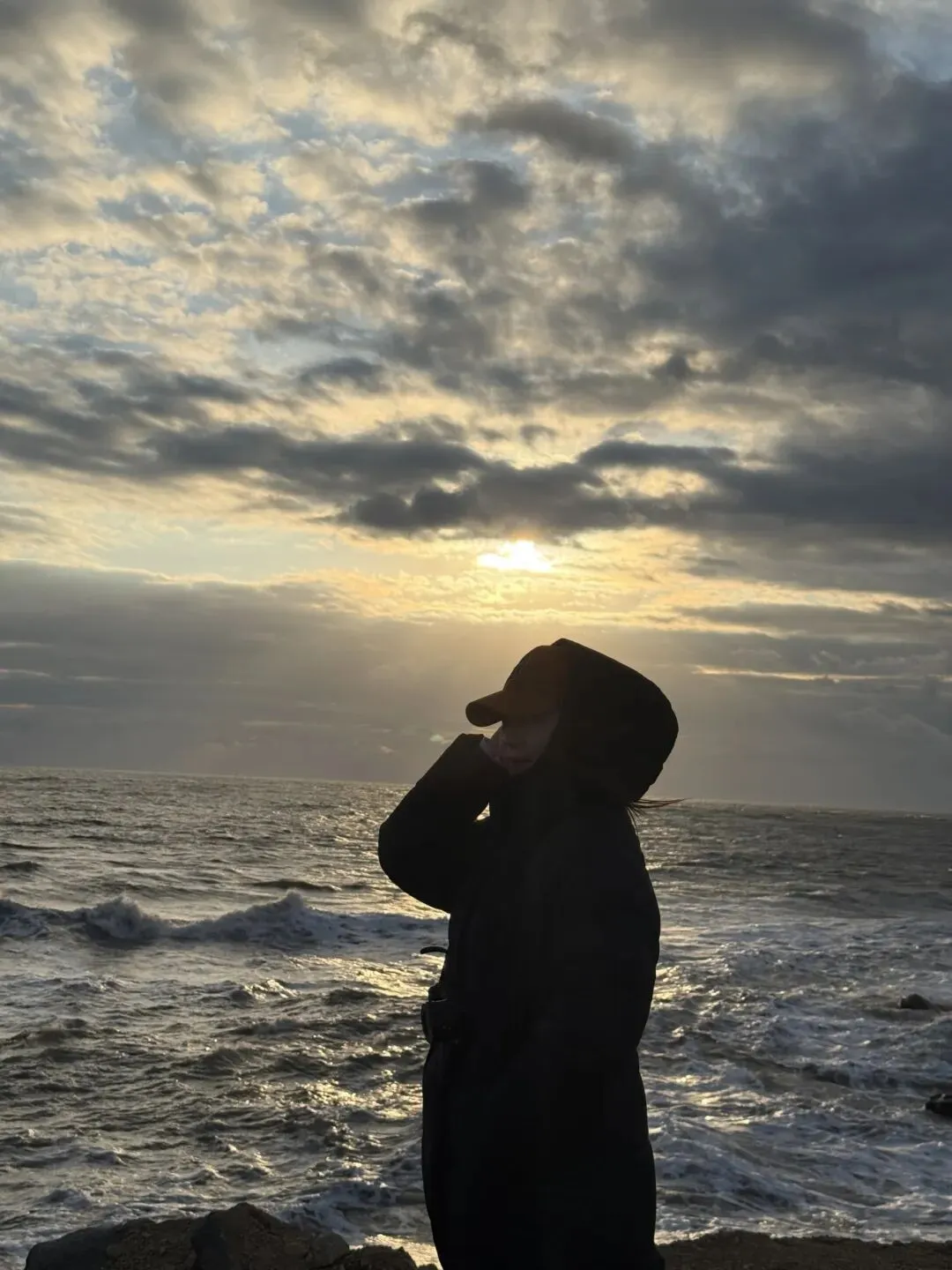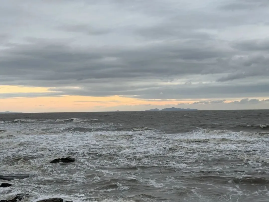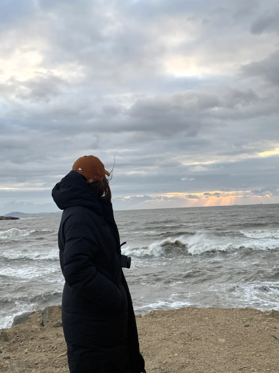 海边的风真的很大,穿着羽绒服带着帽子也觉得冷,6点左右天还是黑的,手机上显示6点40分这样日出,慢慢开始有点天光,但天气还是阴阴的,后面太阳起来,大块的云朵挡着,只看到些许朝霞和微微出现的光,直至后面完全升起,岸边才完全的光亮。