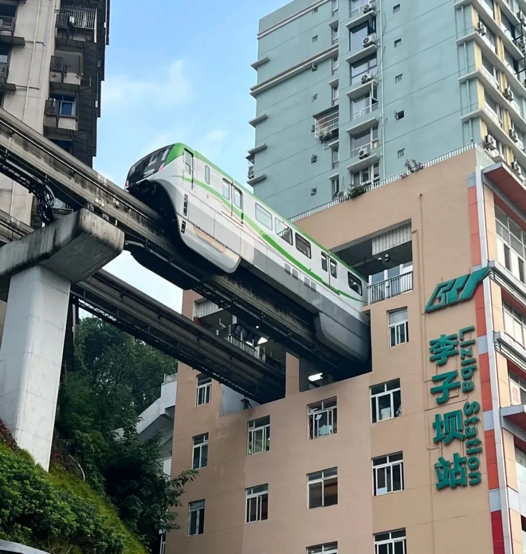 全球罕见的“轻轨穿楼”奇观,国内第一座与商住楼共建共存的跨座式单轨高架车站,乘客在车厢内可体验到“穿楼而过”的震撼感,而游客在观景平台上则能360°无死角地拍摄到列车与楼宇交织的奇观。这种“空中列车穿楼”的视觉冲击力,使其成为重庆“8D魔幻城市”最直观、最生动的代名词。