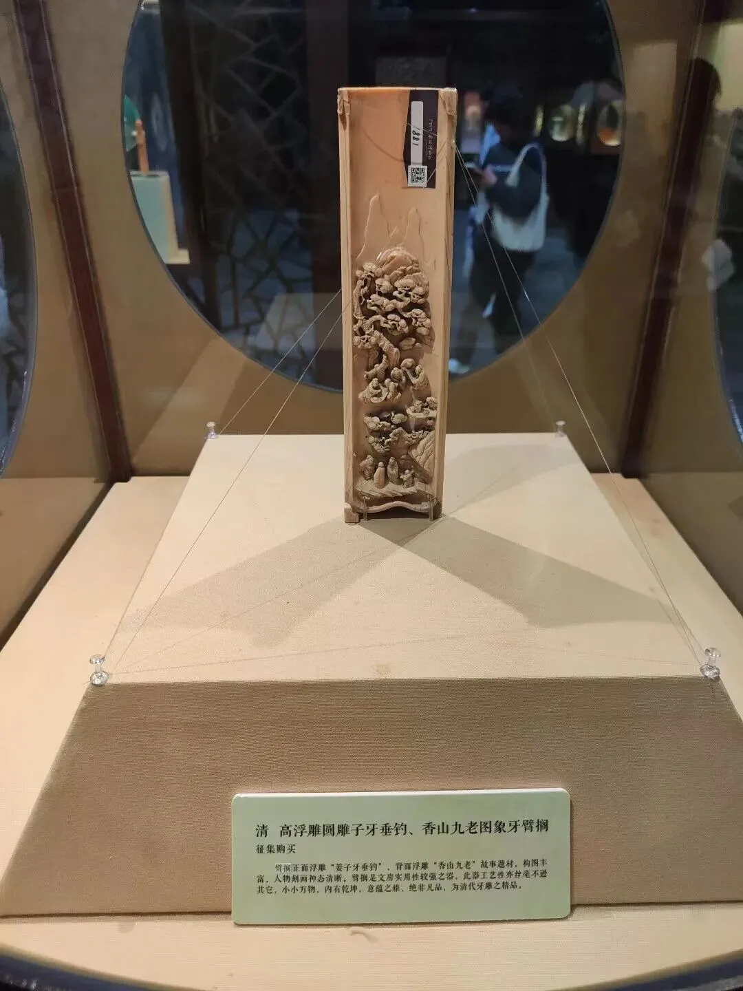 专题陈列“竹刻艺术——秦秉年捐赠明清竹刻珍品展”主要展出由竹刻鉴藏家秦康祥旧藏、其子秦秉年捐赠的明清竹刻珍品,汇集了朱松邻、周颢等名家以及一批有明确纪年的竹刻作品,涵盖笔筒、香筒、臂搁等多种类型,充分展现了深浮雕、透雕、留青等多种雕刻技法。