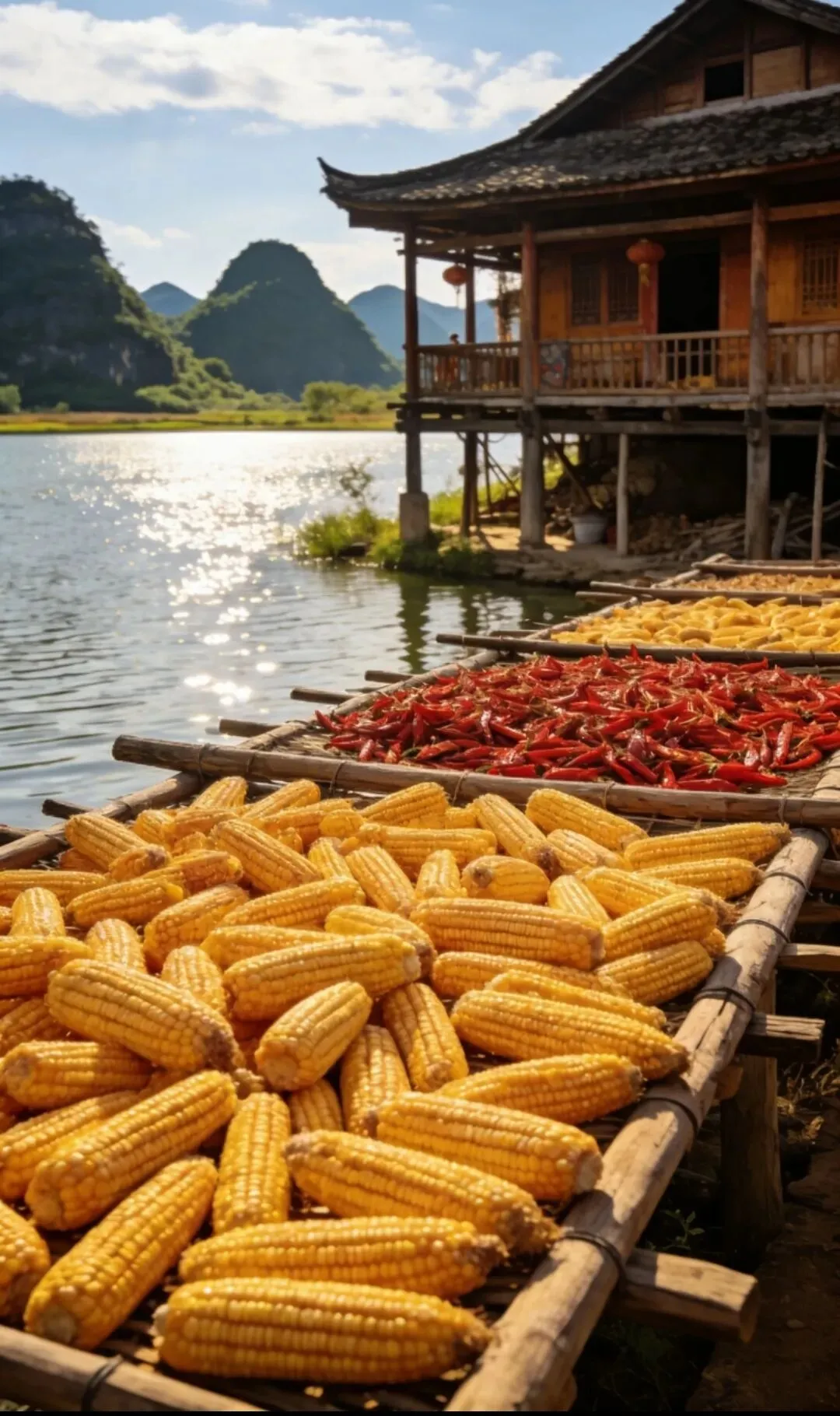 普者黑的建筑多是壮彝传统干栏式吊脚楼,依山傍水错落排布,满是古朴韵味。木桩撑起楼阁,下层养畜上层住人,木质栏杆雕花精致,黛瓦映着碧水青山;屋前搭着晒台,挂着金黄玉米、火红辣椒,烟火气十足;湖畔彝家水乡青石板铺路,小桥流水绕村舍,推门见荷田峰林,宛如世外桃源。每一栋建筑都与山水相融,住进这里,便是住进了田园诗里:民族华服映荷田,一眼惊艳醉流年