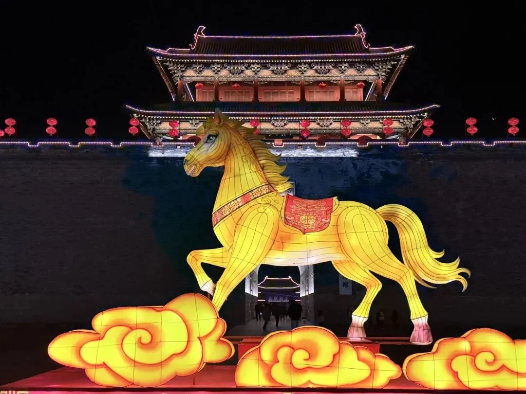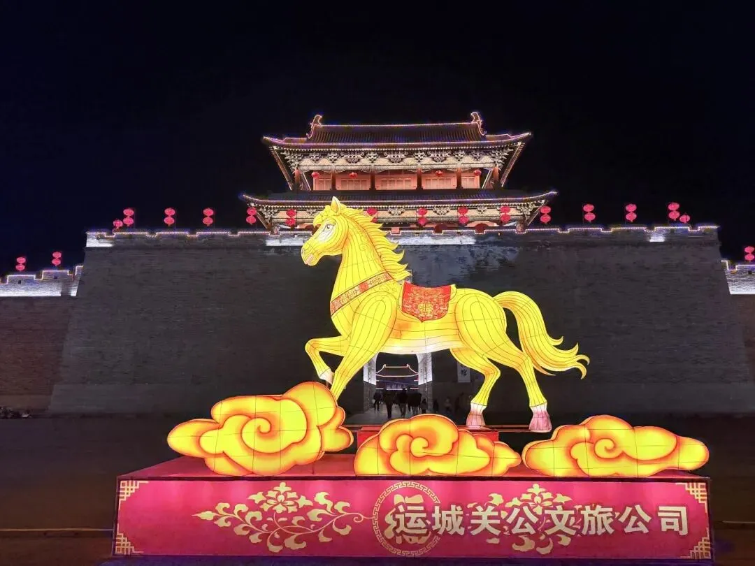 中禁门北广场的主题灯组气势非凡,核心是一匹神采奕奕的鎏金骏马,它昂首腾跃于流转的七彩祥云之上,仿佛正欲踏云疾驰,寓意“马到成功”、“龙马精神”,为您点亮新春鸿运。灯展还巧妙融入了河东深厚的池盐文化——主灯两侧,以“晶莹盐晶”与“盐池叠雪”为灵感打造的灯组同样栩栩如生,在灯光映衬下,仿佛闪烁着千年盐湖的微光,与中央的骏马祥云相映生辉,为佳节增添了独特的文化韵味。