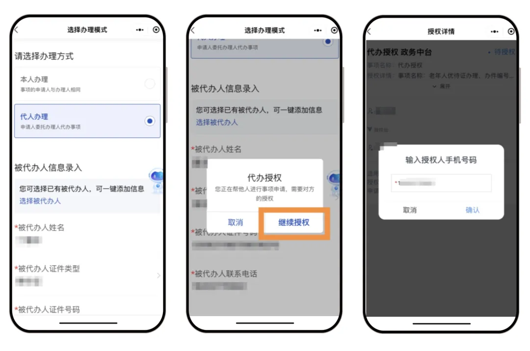 2.以“代人办理”为例。选择“代人办理”后,填写代办人信息,进行“代办授权”。“代办授权”可选择“面对面授权”,也可进行“远程授权”,输入授权人手机号码后,授权人将收到短信,点击网址进入“浙里办”就可以成功授权。