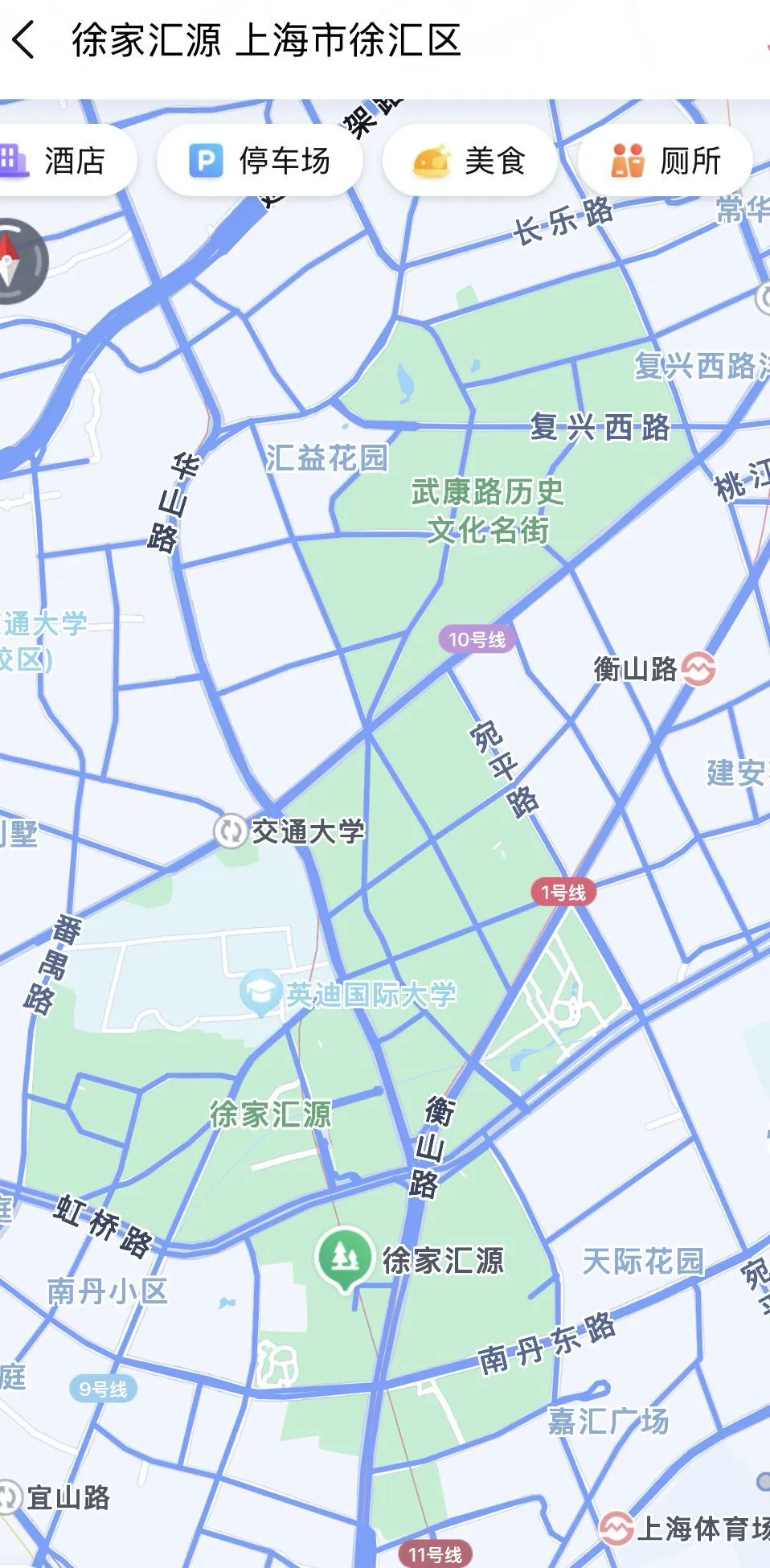 我就按她的意向进行规划路线。发现这些地方都集中在徐家汇。随着深入“挖掘”,这些景点有个共同的名字叫“徐家汇源”,并且在地图上有标明。