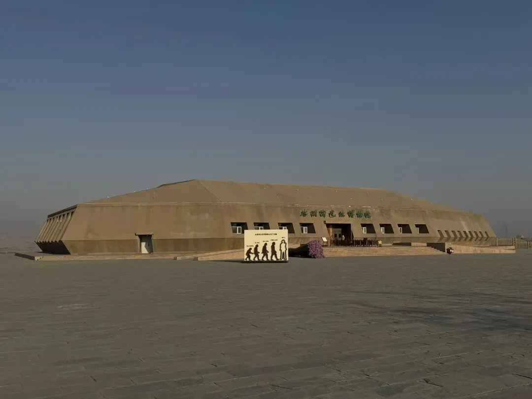 站在公里边,从远处眺望这个人类历史文明的发祥地,最先进入眼帘的是那道横亘于天地之间的、仿原始雅丹地貌的巨型夯土墙体。它不是精细的仿古建筑,而是对水洞沟本土地貌一种粗粝而诗意的提炼。墙体呈现出被亿万年风雨侵蚀后的纹理,沟壑纵横,层理分明,仿佛将景区内那著名的地质剖面直接截取、放大、竖立于此。