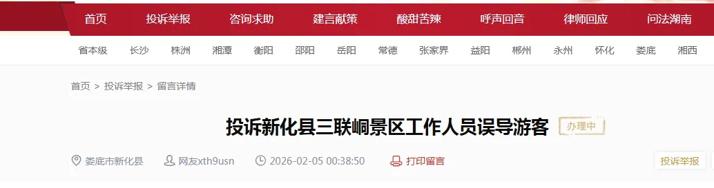 我于昨日(具体日期:2026年2月4日)首次前往三联峒景区游览,期间因工作人员的严重误导,导致我与家人(包括一名三岁幼儿)在雨天路滑的情况下,被迫行走极其陡峭、危险的山路,身心遭受极大压力,且生命安全一度受到威胁。现特此投诉,希望景区对此事予以重视并作出合理解释与处理。