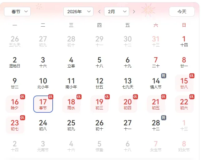 2月15日(农历腊月廿八、周日)至2月23日(农历正月初七、周一)放假调休,共9天。2月14日(周六)、2月28日 (周六)上班。