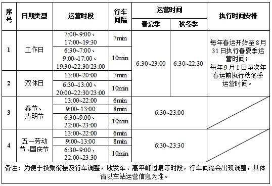 调整后线网执行春夏季和秋冬季运营时间,春夏季运营时间为6:30~23:00,秋冬季运营时间为6:30~22:30,五一劳动节和国庆节假期期间运营时间为6:30~23:30,元旦、春节、清明节、端午节、中秋节假期期间运营时间为6:30~23:00。