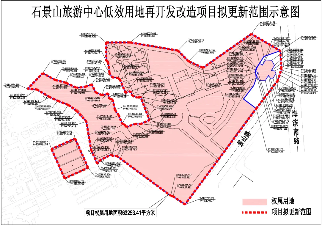 珠海市石景山旅游中心有限公司申请对位于景山路北侧、海滨南路西侧的石景山旅游中心低效用地再开发改造项目进行拆建类城市更新,依据国家低效用地再开发政策及《珠海经济特区城市更新管理办法》规定,参照我市现行城市更新项目申报审批程序要求,为充分征求相关利害关系人的意见,我局现对该更新单元计划内容进行公示。拟更新范围内的相关业主对公示内容有异议或任何疑问的,可以在公示期间内向珠海市香洲区城市更新局咨询反映。现公示如下: