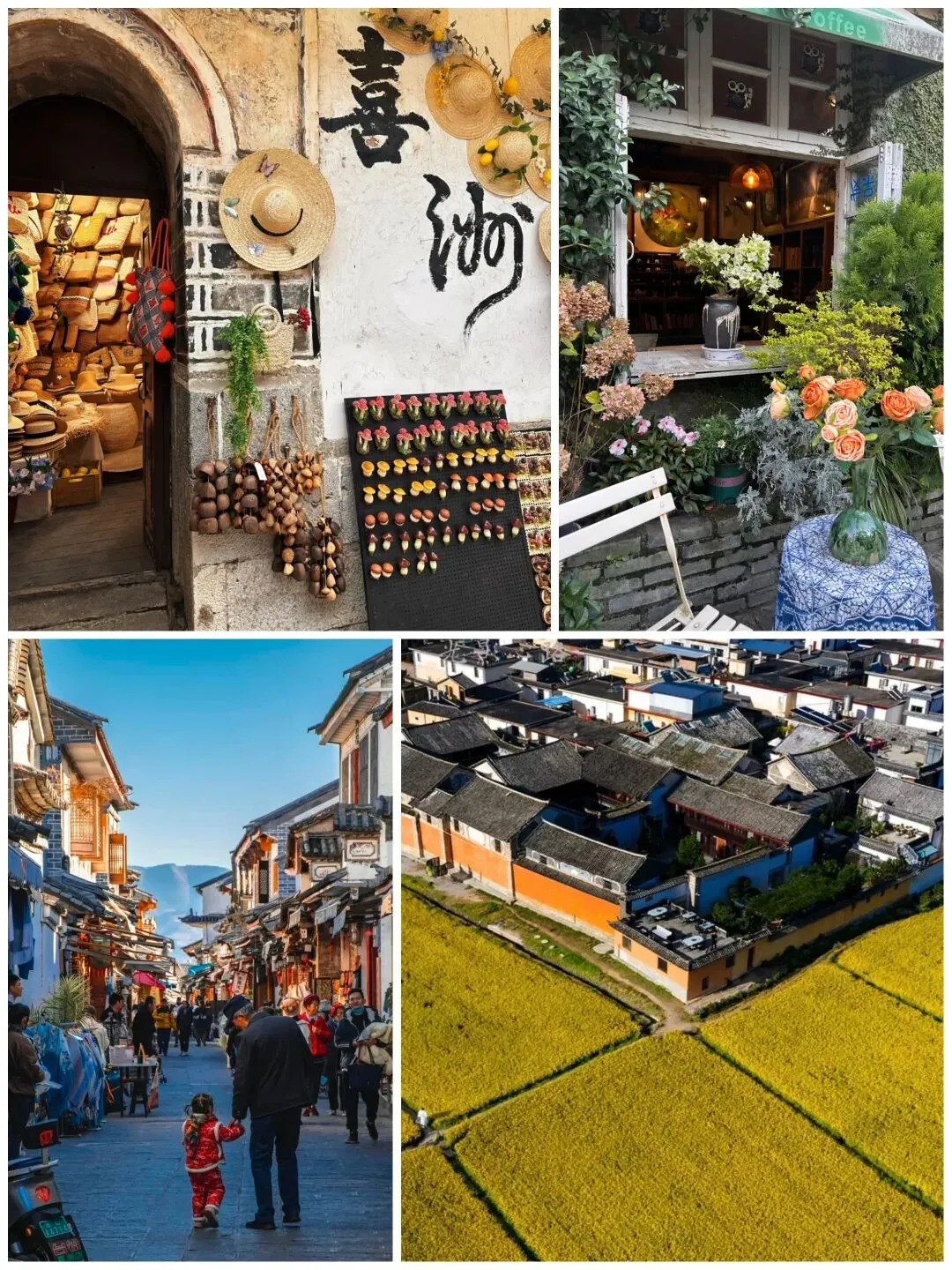 喜洲在唐代曾是南诏国的第一个古都,清代至民国时期,以“喜洲商帮” 闻名,富商回乡兴建了大量精美宅院,奠定了今日的古镇风貌,古镇现存 110 余院白族特色传统建筑,是典型的 “三坊一照壁” 及 “四合五天井” 的白族庭院格局。代表性建筑有严子珍大院、董家大院等。