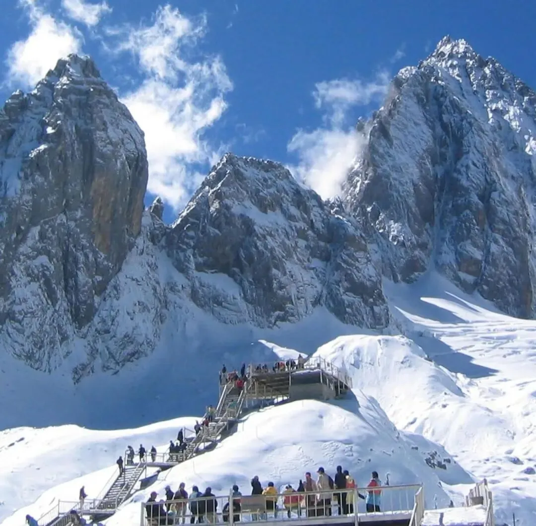 玉龙雪山是北半球纬度最低、距离赤道最近的现代海洋性冰川雪山,在纳西语中被称为“欧鲁”,意为“天山”,是纳西族人心中的“神山”。乘冰川大索道从海拔 3000 米的草甸出发,穿越高大挺拔的各种松林杉树,到达4506 米高的雪山冰川,可徒步至4680米,触摸千年冰川。