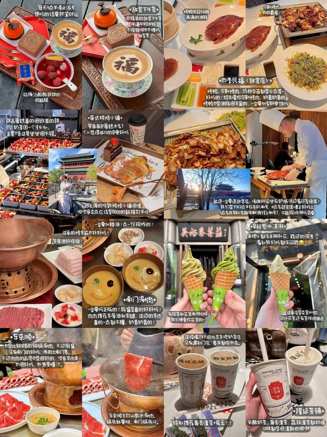 必吃正餐:烤鸭(全聚德、四季民福)、铜锅涮肉(东来顺、聚宝源)、京味菜(局气、北平楼)。