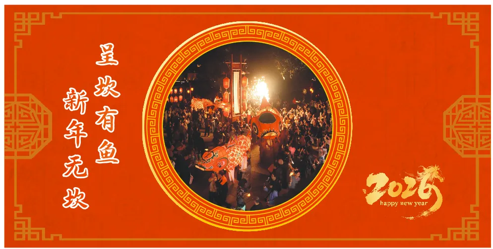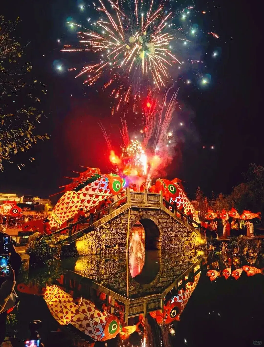 经鱼化桥→过登高桥→抵广场,见证七彩祥云烟花在夜空绽放,鱼灯与烟火共舞!