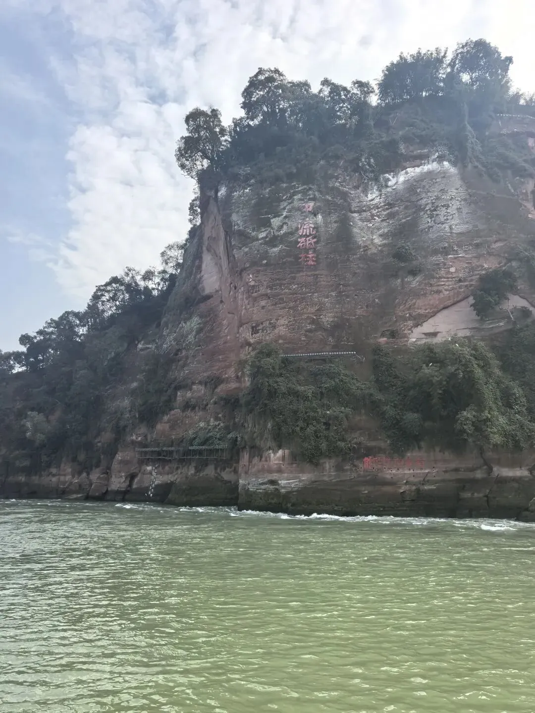 乐山大佛位于青衣江、大渡河和岷江三江交汇处。在乌尤码头登船,在碧波荡漾的江面逆流而上,不多时,看到江水愈发湍急,浪花如万马奔腾,不断冲击拍打着江边的山崖,郁郁葱葱的树木掩映苍茫的大山,山崖转角处裸露的岩壁上,由上而下刻着四个大字“中流砥柱”,细细观瞧,山崖上隐隐可见悬棺洞穴和木制栈道,船头向右一转,便到了乐山大佛脚下。