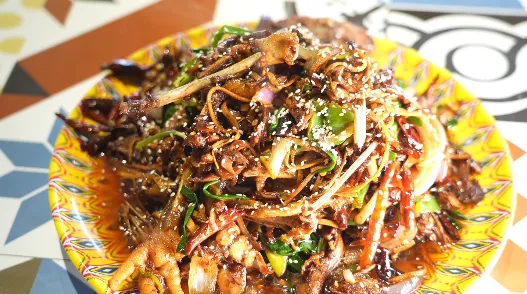 03 爆炒椒麻鸡 鸡肉弹牙劲道,椒麻香气浓郁,下饭下酒双绝。 04 大盘鸡 鸡肉紧实、土豆软糯,酱汁裹满食材,香辣过瘾超下饭。