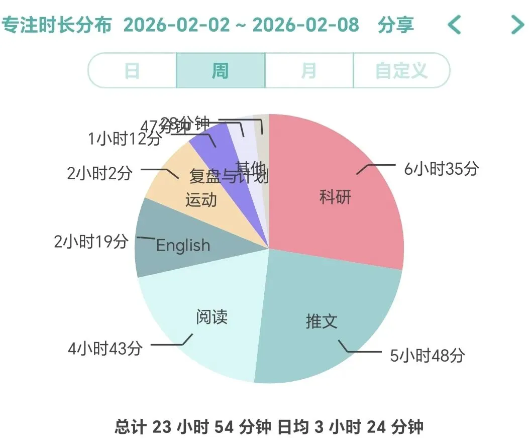 复盘:这周大部分时间都在旅游,所以在学习方面没有很严格,时间记录比较松懈。