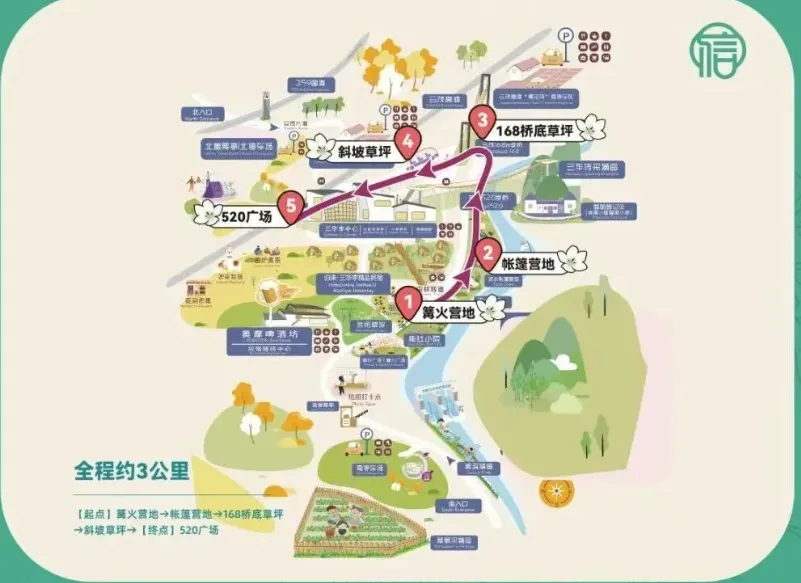 从篝火营地启程,穿过帐篷营地、168 桥底草坪与斜坡草坪,漫步到 520 广场。全程平缓舒适,适合带娃撒欢,也适合情侣牵手漫步,在营地与花海的包围里,浪漫直接拉满。
