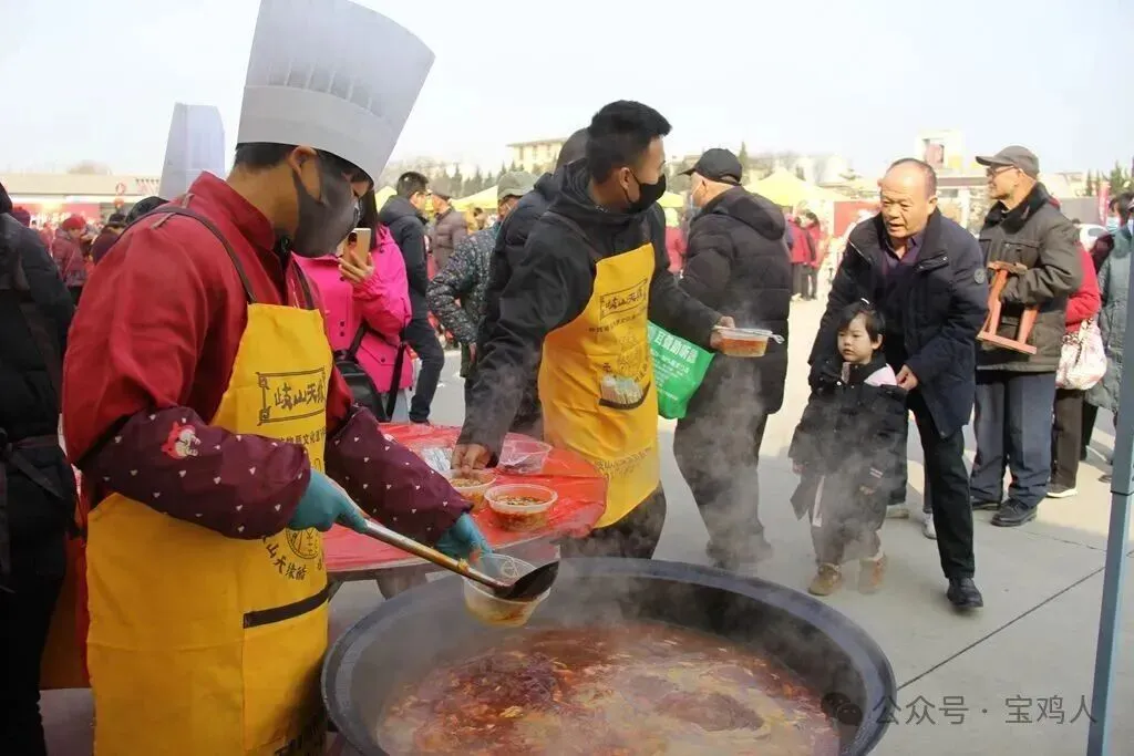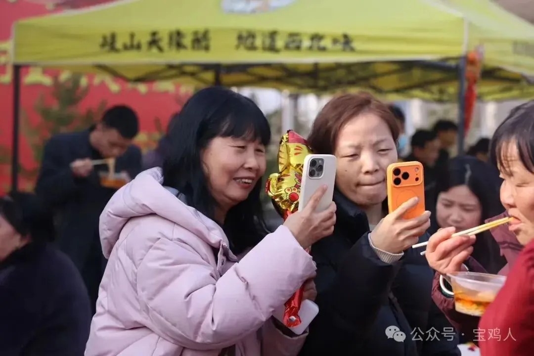 在现场,“同咥臊子面,共吃真醋粉”成为民众的热捧。组委会特别邀请专业厨师团队,用天缘开发出的成果——“臊子面酸汤汁”为大家奉献节日大餐。新鲜的食材,一大早就被大厨们通过现场烹制,成为臊子面的伴侣。而真正的灵魂之味,全在那一锅香气四溢的臊子汤之中。