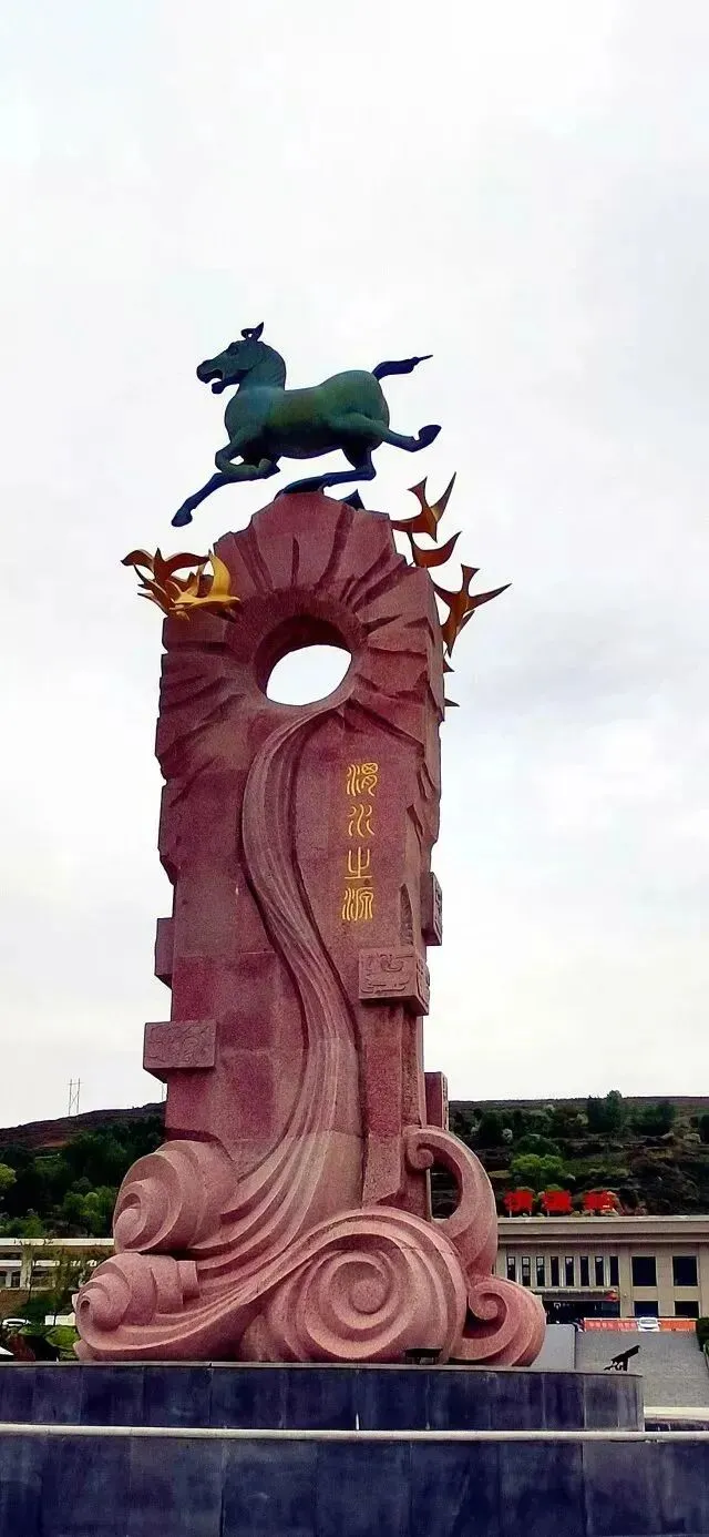 (渭源火车站广场的标志,除了奔马🐴与渭源无关,下半部分渭水之源整体不错。作为中国旅游标志,奔马塑像复制品已经蔓延至甘肃大地,兰州武威天水等地都有不少,渭源还要复制就是馓饭两碗两碗馓饭了。与渭源地域地理文化历史人文,关系最密切最有深厚寓意的,恐龙蛋化石最有资格,因为渭源出土的甘肃第一枚恐龙蛋化石,迄今为止还没有在渭源境内任何一个公众场合,与渭源民众及其外来游客过客见过面。