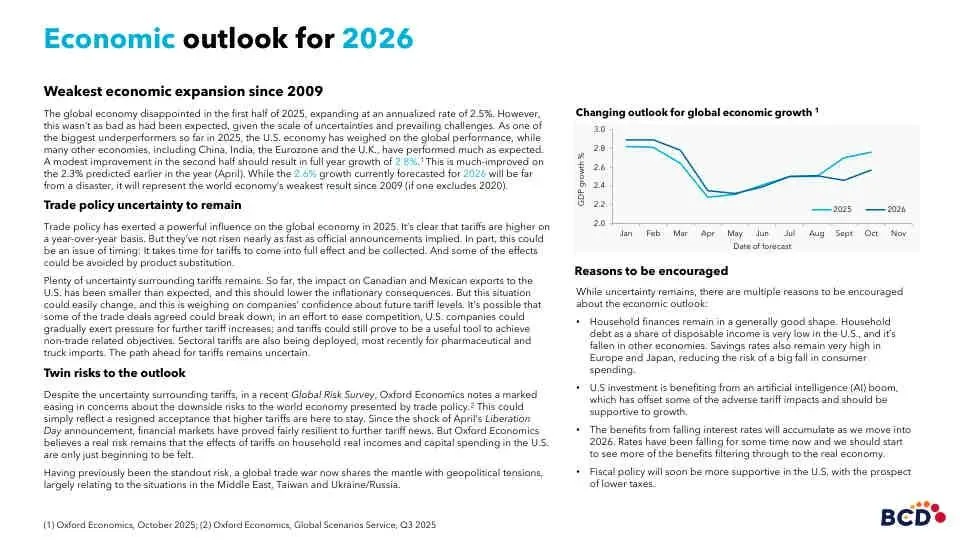 - 全球经济增速放缓:2026年预计全球GDP增长 2.6%,是自2009年(除2020年外)以来最弱的一年。