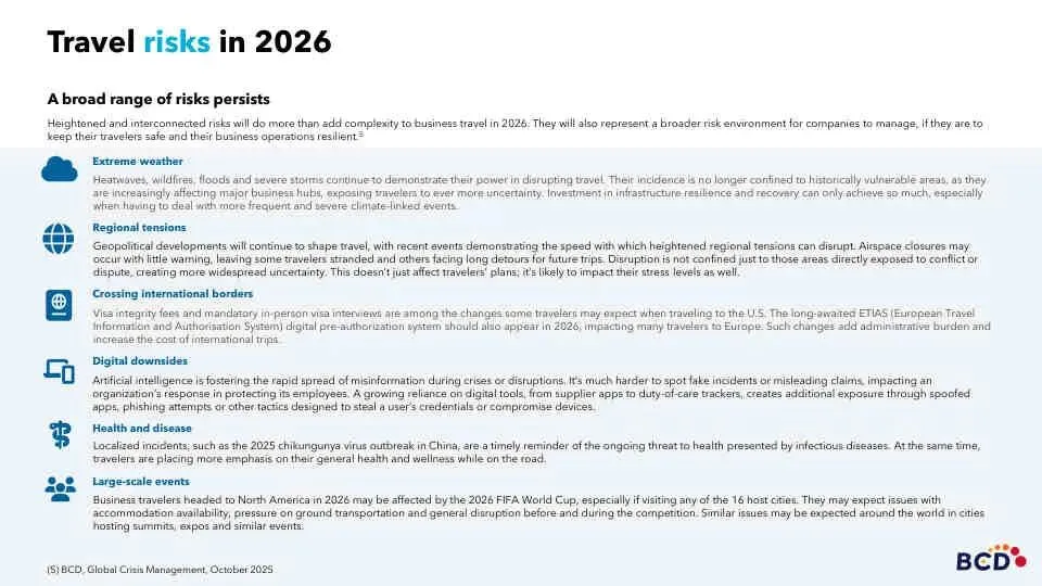 | 4. 健康与疾病 | 地方性传染病(如2025年中国基孔肯雅热)随时可能爆发;员工也更关注旅途中的身心健康。 | 提供实时健康预警、医疗援助和心理支持,优化差旅政策减少“过度出差”。 |